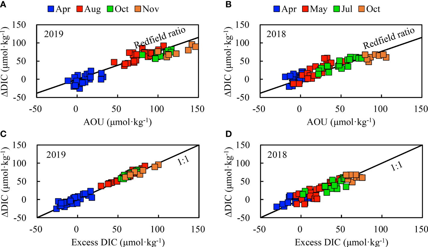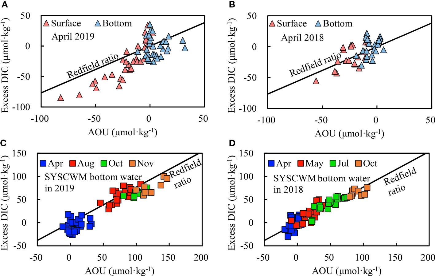 Relationship between excess DIC and AOU in the SYS in spring (A, B) and in the SYSCWM from spring to autumn (C, D). The relevant Redfield ratio is traditionally estimated as excess DIC : AOU = 106:138.