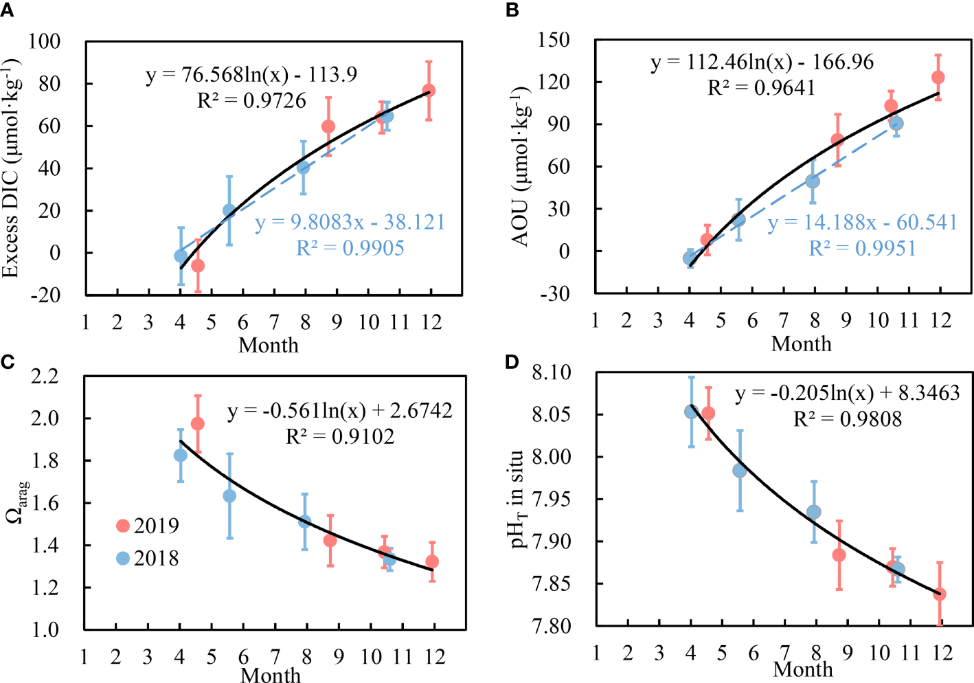 Monthly variations in Ωarag(D), pHT(C), excess DIC (A) and AOU (B) in bottom waters of the SYSCWM. Logarithmic fitting curves (solid black lines) and the optimal regression equations of parameters versus months were plotted, based on all of eight surveys over 2018 and 2019. The blue dashed lines indicate the optimal linear regression of parameters versus months in 2018.