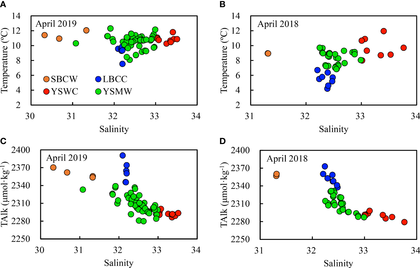 Relationships between water temperature and salinity (A, B) and between TAlk and salinity (C, D) in the SYS in spring. Only surface and bottom-water data were plotted. SBCW, Subei Coastal Water; LBCC, Lubei Coastal Current; YSWC, Yellow Sea Warm Current; YSMW, Yellow Sea Mixed Water. Locations of typical SBCW, LBCC, and YSWC waters observed in April 2019 are shown in Figure 1B.
