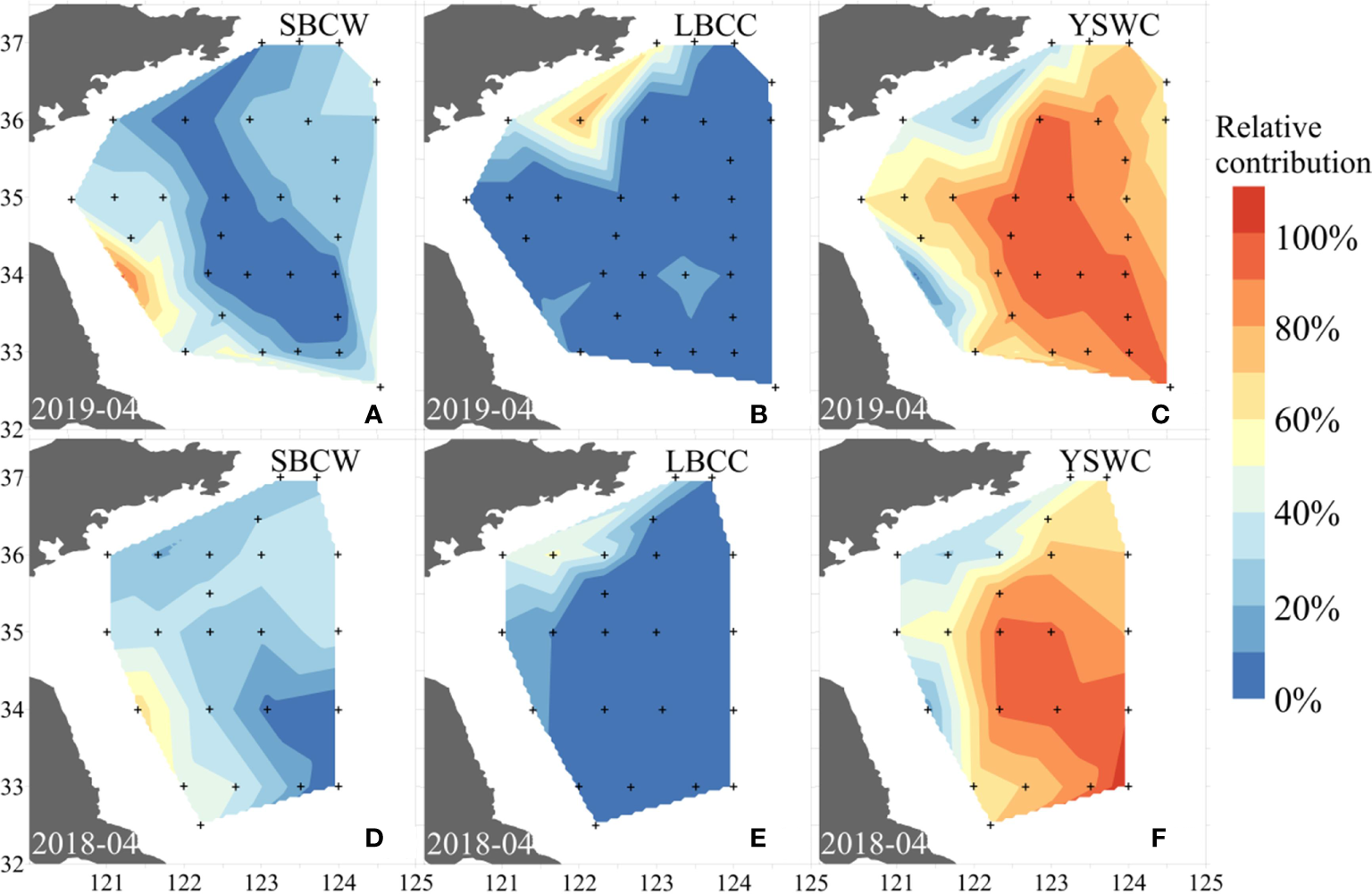Relative contributions of SuBei Coastal Water (SBCW), LuBei Coastal Current (LBCC) water, and Yellow Sea Warm Current (YSWC) water in the bottom layer of the SYS in April 2019 (A–C) and April 2018 (D–F).