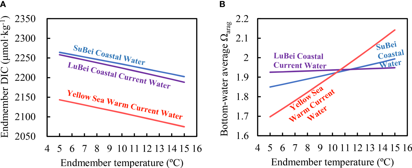 The lower annual initial Ωarag caused by the lower water temperatures in spring 2018 subjected the growth of calcifying organisms inhabiting the SYSCWM to environmental stress earlier than in 2019. To examine how the spring thermal state affected the annual initial Ωarag, the CO2SYS software and equation (1) were used. By inputting the given salinity, Talk, and of a certain endmember, and changing its water temperature, we obtained the temperature-dependent, air-equilibrated DIC values of the water endmember. Then, we calculated bottom-water DIC values solely from conservative mixing at each station in spring. The basin-averaged DIC and Ωarag were also simulated for the entire region. Our simulation showed that the three water types exhibited similar thermal sensitivity to DIC changes (Figure 9A). However, the cooling in the YSWC had a far greater impact on the spring basin-averaged Ωarag than did the cooling in the two other water types (Figure 9). This was because the volume of YSWC water was the greatest of the three water types and may even have overwhelmed the SYS in winter and early spring (Figure 8). A re-equilibrium of the YSWC water with atmospheric CO2 at a given temperature in late winter and/or early spring determined the initial Ωarag of the SYSCWM before Ωarag declined in late spring, summer, and autumn (Xiong et al., 2020).