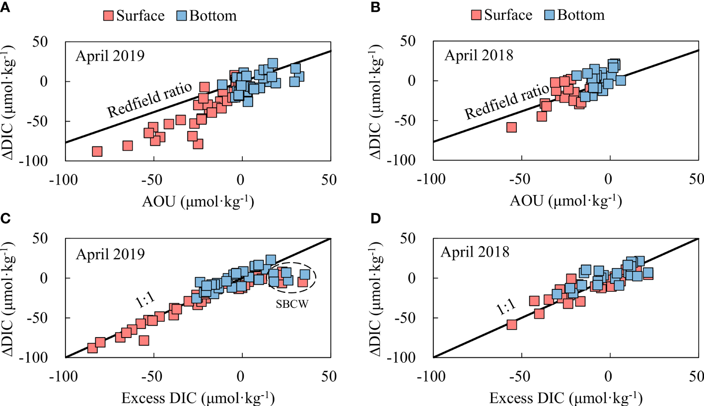 Relationship between ΔDIC and AOU (A, B) and between ΔDIC and excess DIC (C, D) in the SYS in spring. ΔDIC means non-conservative addition (positive values) and/or removal (negative values) [see equation (7)]. In panel (C), the outliers in a dashed circle were collected at stations H23, H25, H26, H27, and H28 (Figure 1B), where water depth (<20 m) was extremely shallow. Dissolved oxygen was roughly 100%, while dissolved CO2 was oversaturated, inducing excess DIC values. SBCW, SuBei Coastal Water.