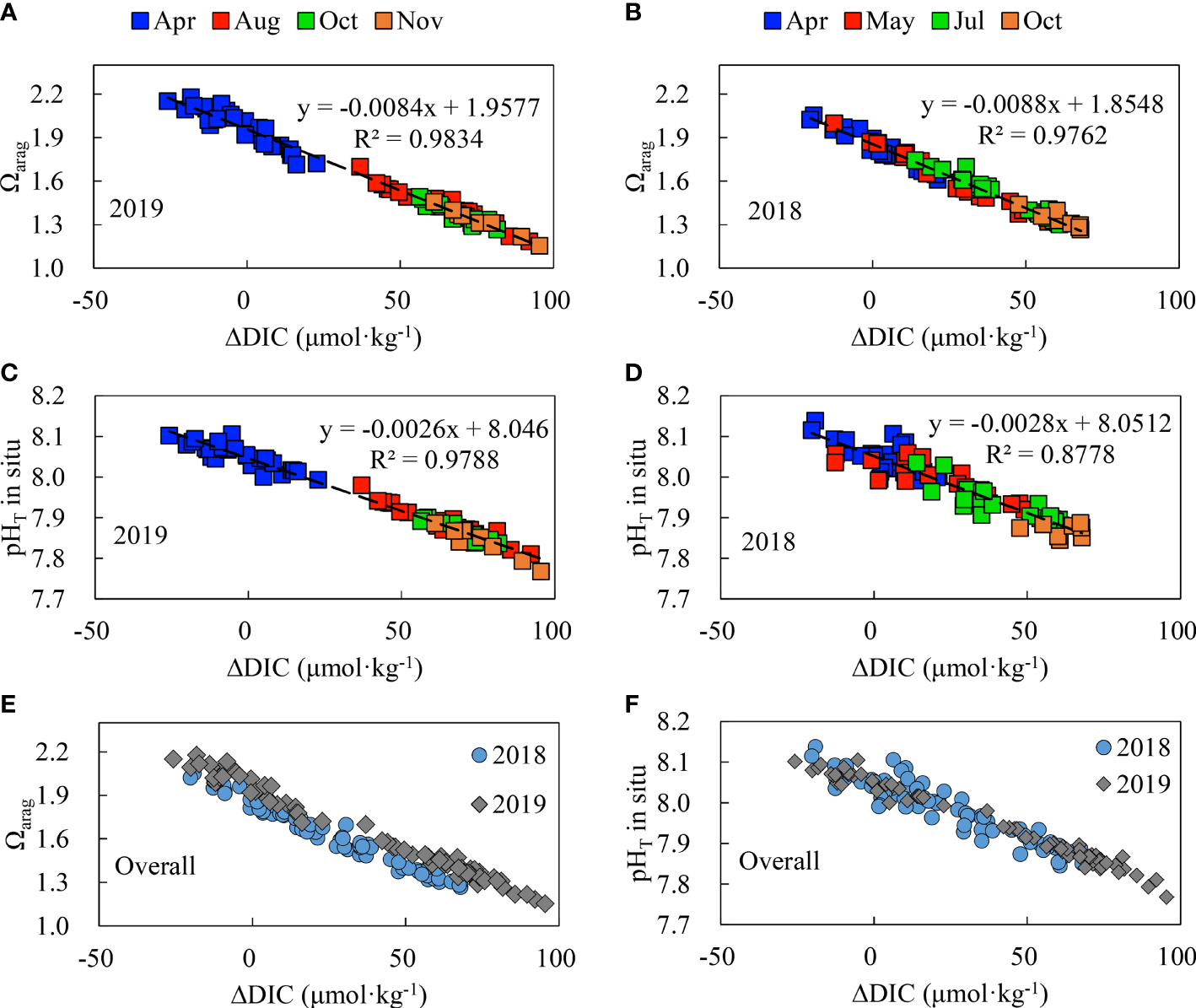 Some researchers have suggested various negative correlations between Ωarag and total dissolved inorganic carbon (DIC) concentration (e.g., Liu et al., 2014; Zhai et al., 2014; Wang et al., 2017; Zhai, 2018). Recently, Huang et al. (2021) proposed a sensitivity index of coastal Ωarag decline to DIC addition; that is, the DIC addition of 100 μmol·kg–1 to an Ωarag decline of 1.0 in the northern Gulf of Mexico. They argued that this realistic and ecosystem-based sensitivity index was consistent with conditions revealed in the western Gulf of Maine. However, before this sensitivity index can be widely applied in diverse coastal seas, its validity should be further examined.