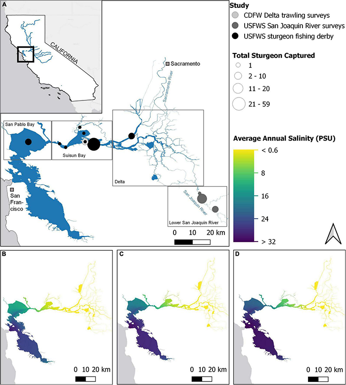 Environmental conditions in the SFE are highly dynamic (Kimmerer, 2004), with a salinity gradient from upstream freshwater habitats in the Sacramento-San Joaquin River Delta to marine habitats in San Francisco Bay, and variable brackish conditions through Suisun and San Pablo Bays (Figures 1B–D). The SFE exhibits California’s Mediterranean climate exemplified by warm, dry summers and cool, wet winters. Furthermore, interannual variation in precipitation and subsequent freshwater runoff is high, and similarly, water temperatures and clarity vary spatially and seasonally (Kimmerer, 2004; Cloern, 2019). Native species, such as White Sturgeon, have physiologically and behaviorally evolved to thrive within this dynamic landscape; however, anthropogenic alterations to the local hydrograph and climate are increasingly compressing available habitat quantity and quality (Cloern et al., 2011). For example, as the SFE continues to warm, thermal stress is likely to increasingly impact population dynamics of sensitive species (Brown et al., 2016). Reductions in freshwater outflow, combined with sea level rise, are likely to push salinity gradients further inland, reducing the amount of estuarine habitat, further exacerbating warming trends (Feyrer et al., 2006; Brown et al., 2016). Continuing weather pattern changes, coupled with upstream reservoir sediment capture and expanding aquatic macrophytes, are also likely to impact SFE water turbidity and temperature (Hestir et al., 2016; Bever et al., 2018).
