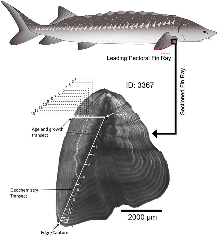 Example fin ray with microstructure and microchemistry analysis trajectories indicated. The white dashed line follows an annulus from the transect used for geochemistry to the transect used for aging. Drawing of White Sturgeon by Adi Khen.