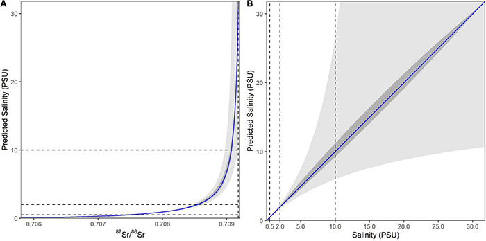 The 87Sr/86Sr to salinity mixing model based on Hobbs et al. (2019). (A) The 87Sr/86Sr to salinity relationship across the 87Sr/86Sr values for the entire SFE. Blue line representing the 70-30 Sacramento to San Joaquin River freshwater endmember and the inner gray band representing the uncertainty introduced by varying between 100% Sacramento and 100% San Joaquin River water. The outer gray band represents the uncertainty introduced into predicted salinities based on the propagated uncertainties from the geochemical analyses. (B) The relationship between predicted versus measured salinity values, showing that prediction uncertainty increases asymmetrically with salinity. Dashed lines show the 0.5, 2, and 10 salinity cutoffs used to identify different habitats. Note that due to these increasing uncertainties salinities >10 psu were treated here as “high salinity” and include salinity values from 10 to 32 (seawater).
