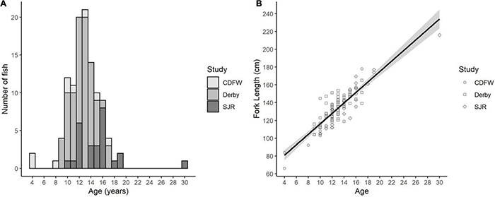 (A) Histogram of number of fish in each age bin, and (B) fork length to fish age relationship (R2 = 0.77). Study designates the origin of the samples collected from the California Department of Fish and Wildlife (CDFW) trawling surveys, sturgeon sport fishing derbies (Derby), or the San Joaquin River (SJR) gill and trammel net surveys.