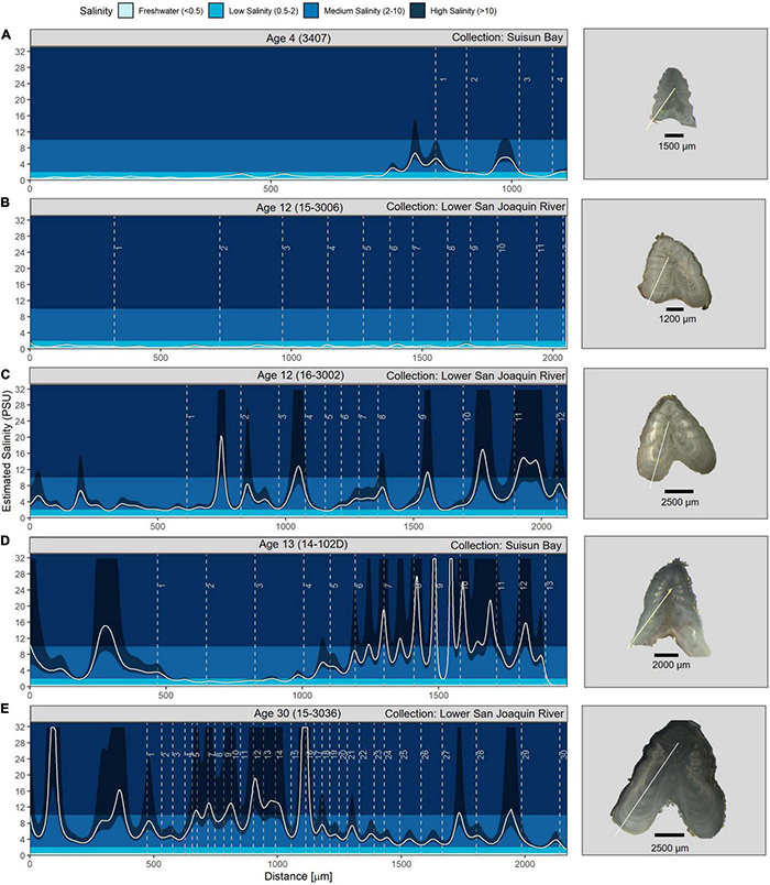 Salinity profile examples showing variability in use of different salinity habitats across a range of ages. The white line is the salinity spline, and the dark shaded area is the associated estimated uncertainty. Note patterns at higher salinity values are less certain due to the non-linear nature of the mixing curve (Figure 3). Dashed vertical age lines represent the opaque (summer) portion of the annuli. Note the x-axis range varies among different plots because of fish age and because fin ray sections were cut from different fin ray regions across individual fish. The fish ID is shown at the top of each graph and links to the Supplementary Table 1. Profiles for all fish are shown in Supplementary Figure 1 and annual average salinities for each fish are in Supplementary Figure 2. An image of each fin ray section is included to the right of each figure to provide a representation of size variability. The white line on the fin rays shows the location of the geochemistry transect. Fin ray images were taken by Shannon Blackburn. (A) is the youngest fish sampled, (B) resided in predominantly fresh- or low-salinity water (B), (C) made short high salinity excursions, (D) exhibited early migration to higher-salinity brackish water, and (E) is the oldest fish sampled.