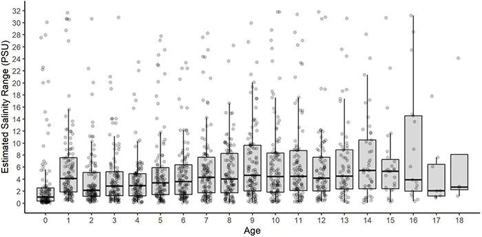 Intra-annual variation (range) in salinity by age for each White Sturgeon. Points represent the salinity range for each year of each fish’s life (maximum-minimum salinity at that age). Box plots show the salinity ranges across all fish within each age class.