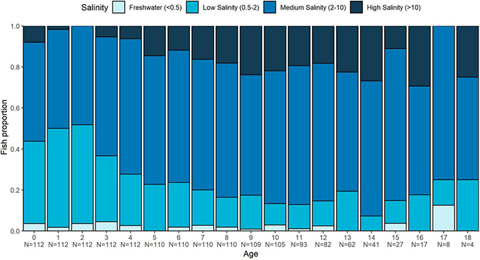 Adequate samples were available to assess annual salinity exposure to 18 years of age. Medium salinities were most common across all annuli for all fish (48–75%, depending on age), followed by low salinity (7–48%), and high salinity (2–29%). Freshwater only accounted for 1–12% of salinity habitat use, and there was no general trend with age. However, there were trends in the dominant salinity value by age group. For age 0–3, for example, an average of 42% (range 32–48%) of fish exhibited low-salinity values, while only 4% (range 0–6%) exhibited high salinity values (Figure 7). Beyond age 3, there was a trend toward a greater proportion of fish inhabiting higher salinity waters (19%, range 2–29%), with only 17% (range 7–33%) in low salinity (Figure 7).