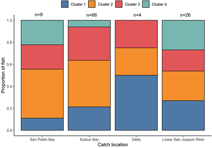 To test whether sample location introduced bias into our cluster analysis, we used a chi-square test to determine whether the proportion of fish assigned to a given cluster differed significantly across capture locations. Initially we tested for differences across four locations: Delta, San Joaquin River, Suisun Bay, San Pablo Bay; however, sample sizes were too low for a robust statistical analysis. Therefore, we combined the capture locations into “upstream” (Delta and San Joaquin) and “downstream” (San Pablo Bay and Suisun Bay) groups. A threshold of α = 0.05 was used to determine significance, but we also considered α = 0.10 threshold to be conservative in our assessment.
