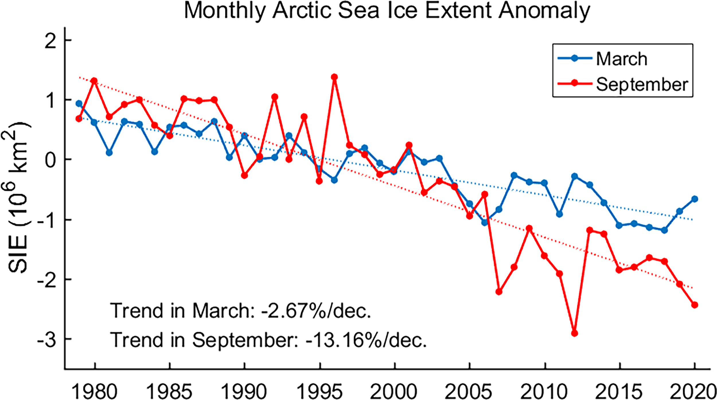 The monthly Arctic sea ice extent (SIE) anomaly relative to the 30-yr reference period from 1981 to 2010. Blue and red dotted lines represent the linear fitting of the extent anomaly in March and September, respectively, and the trends of SIE in the two months are also given. Data are obtained from NSIDC.
