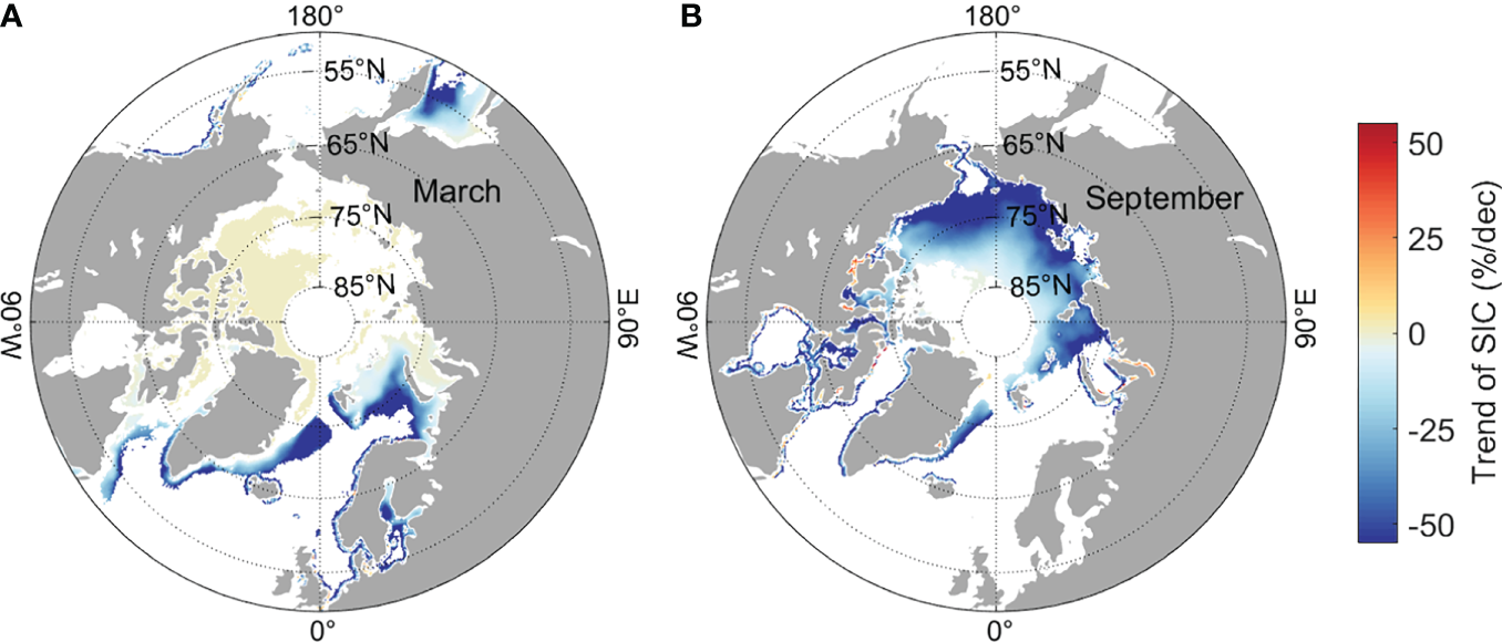 Multi-decadal trend of the Arctic sea ice concentration (SIC) in March (A) and September (B) during 1979–2020. Only trends that are significant at 95% confidence level based on Mann-Kendall test are shown. Data are obtained from NSIDC.