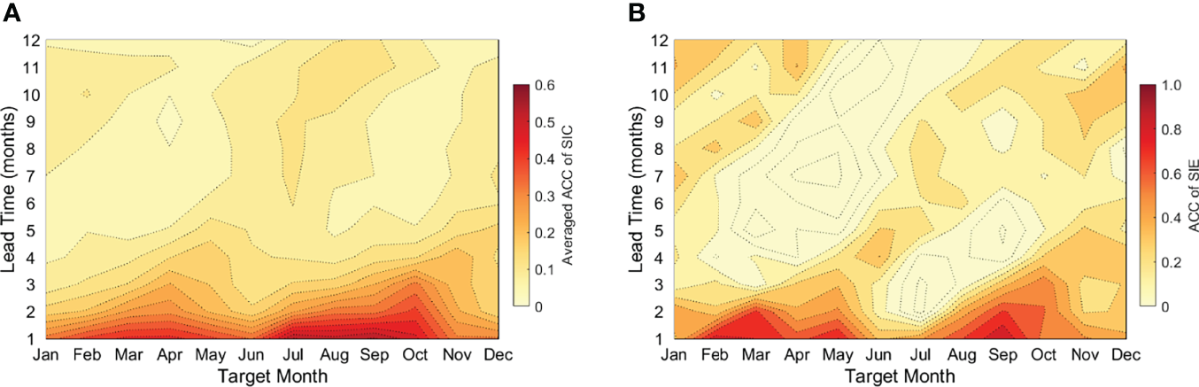 Persistence of the Arctic SIC (A) and total SIE (B) based on the anomaly correlation coefficients (ACCs) of monthly SIC and SIE in January to December at different lead times. Note that ACCs in (A) are the regional averaged values for SIC on all grid points. Data of SIC and the calculated SIE during 1979–2020 are from NSIDC.