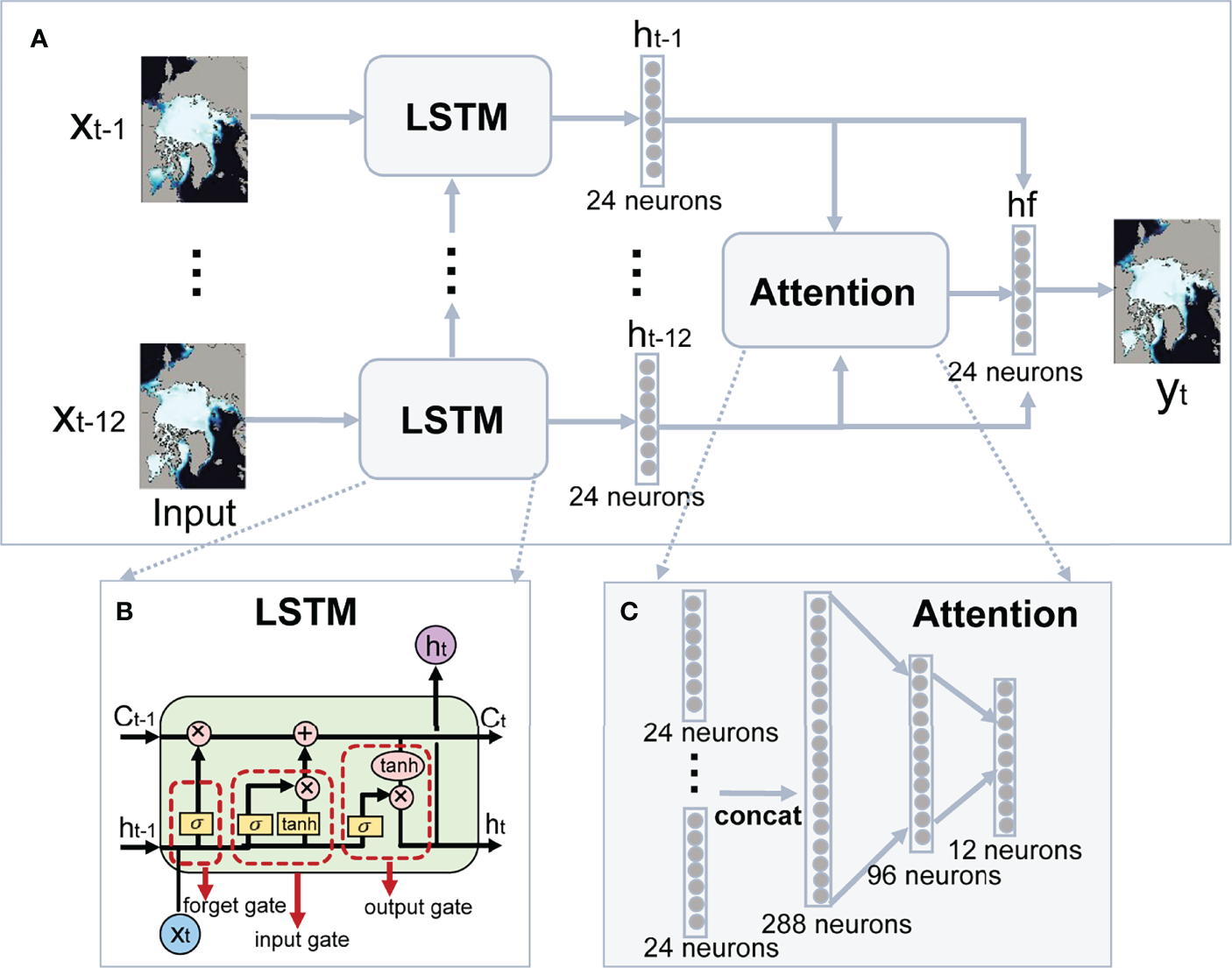 The overall architecture of the attention-based LSTM with combination loss (A) and the details of a single LSTM cell (B) and the attention module (C). In (A), “x” is the input SIC, “y” is the forecasted SIC, “h” denotes hidden state of LSTM, “hf” is the final hidden state processed by the attention module. In (C), “concat” represents the concatenating of all the hidden states together.