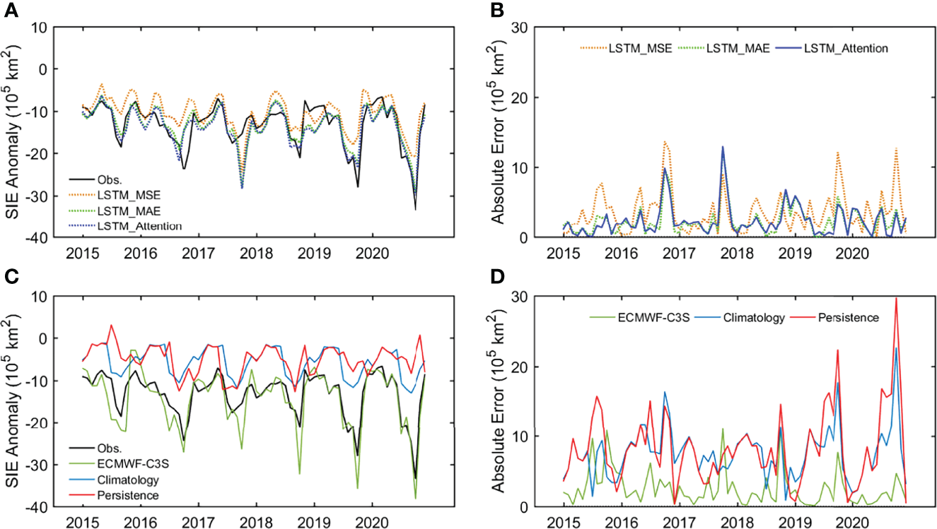 Monthly Arctic SIE anomaly predicted by three LSTM models during January 2015–December 2020, with the satellite observation as a reference (A). Absolute errors of monthly SIE between forecasts from three LSTM models and the observation (B). (C, D) are similar to (A, B), but for sea ice forecasts from ECMWF-C3S, Climatology, and Persistence.