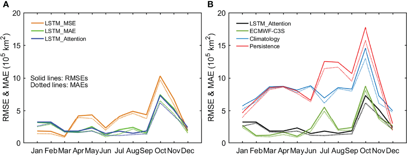 For long-term (i.e., the test period of 2015–2020) averaged SIE in different months among the year, LSTM_Attention demonstrates higher skill than LSTM_MSE and LSTM_MAE in most months of the year. The RMSE and MAE (Figure 6A) of forecasted SIE are the largest in early autumn (October to November). The relatively low skill is probably due to the higher sea ice mobility and thus the larger uncertainty of forecasted ice edge location during this season of year. This is also a common characteristic for sea ice forecasts from the dynamical model ECMWF-C3S and two empirical benchmark models (Figure 6B). Except for February and July, LSTM_Attention shows comparable RMSE and MAE with ECMWF-C3S, especially in late summer and early autumn. Combined with their absolute errors in Figure 5, this result suggests that LSTM_Attention is comparable to dynamical models in predicting ice extent, especially in the season when marine operations peak.