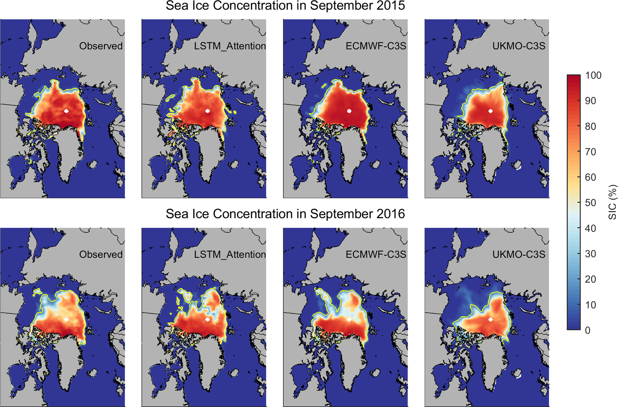 Observed and predicted Arctic SIC by LSTM_Attention, ECMWF-C3S and UKMO-C3S in September 2015 (upper panel) and September 2016 (lower panel). The yellow line in each subplot represents the observed or predicted ice edge for that month.