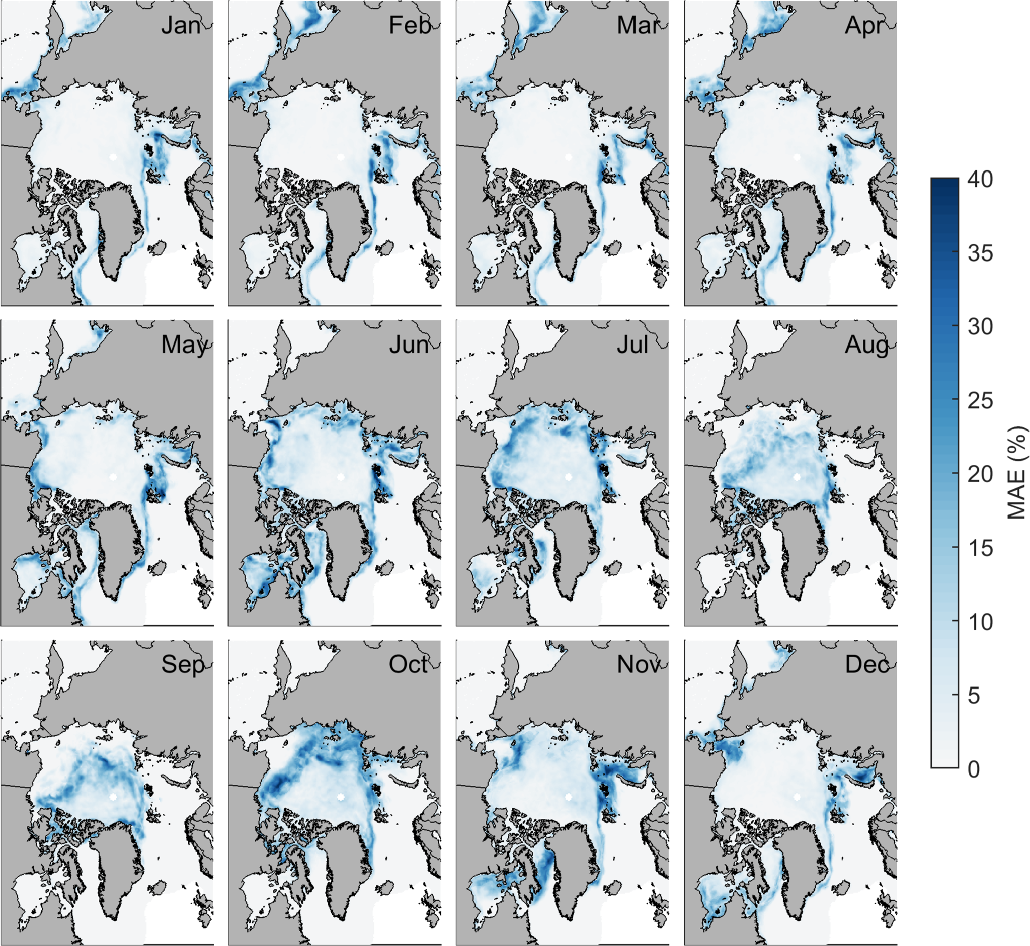 Mean MAE of LSTM_Attention forecasted SIC in January 2015–December 2020 at 1-month lead time.