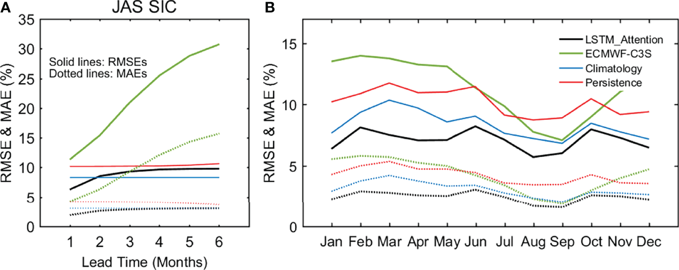 Averaged RMSEs (solid lines) and MAEs (dotted lines) in 2015–2020 of the July–August–September (JAS) SIC forecasts at lead times of 1 month to 6 months (A) and averaged RMSEs and MAEs in 2015–2020 of monthly SIC forecasts at 1-month lead time (B) using LSTM_Attention, ECMWF-C3S, climatology, and persistence.