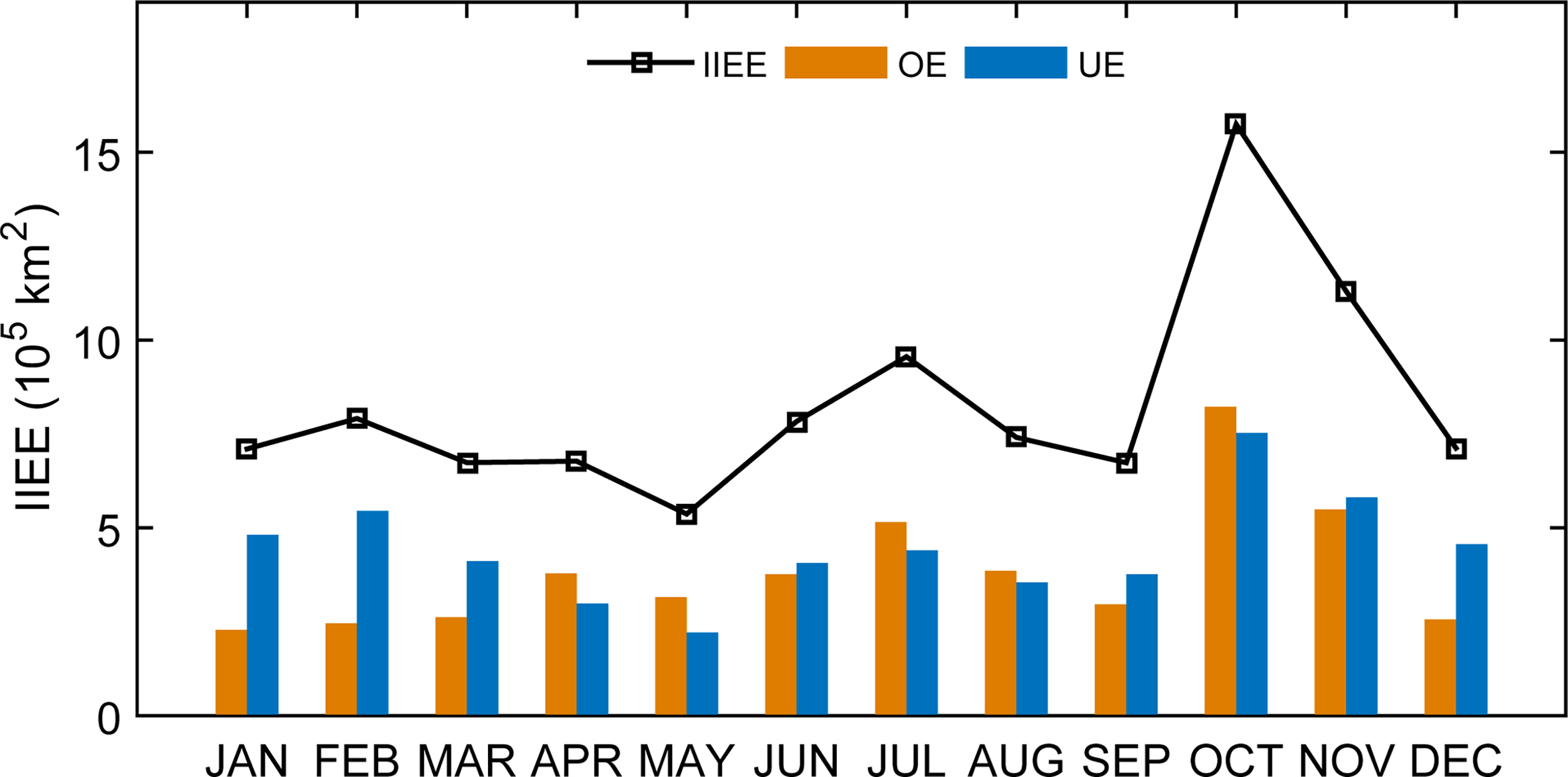 Seasonal cycle of IIEE and its two components, overestimated error (OE) and underestimated error (UE), during the test period 2015–2020 from sea ice forecast of LSTM_Attention.
