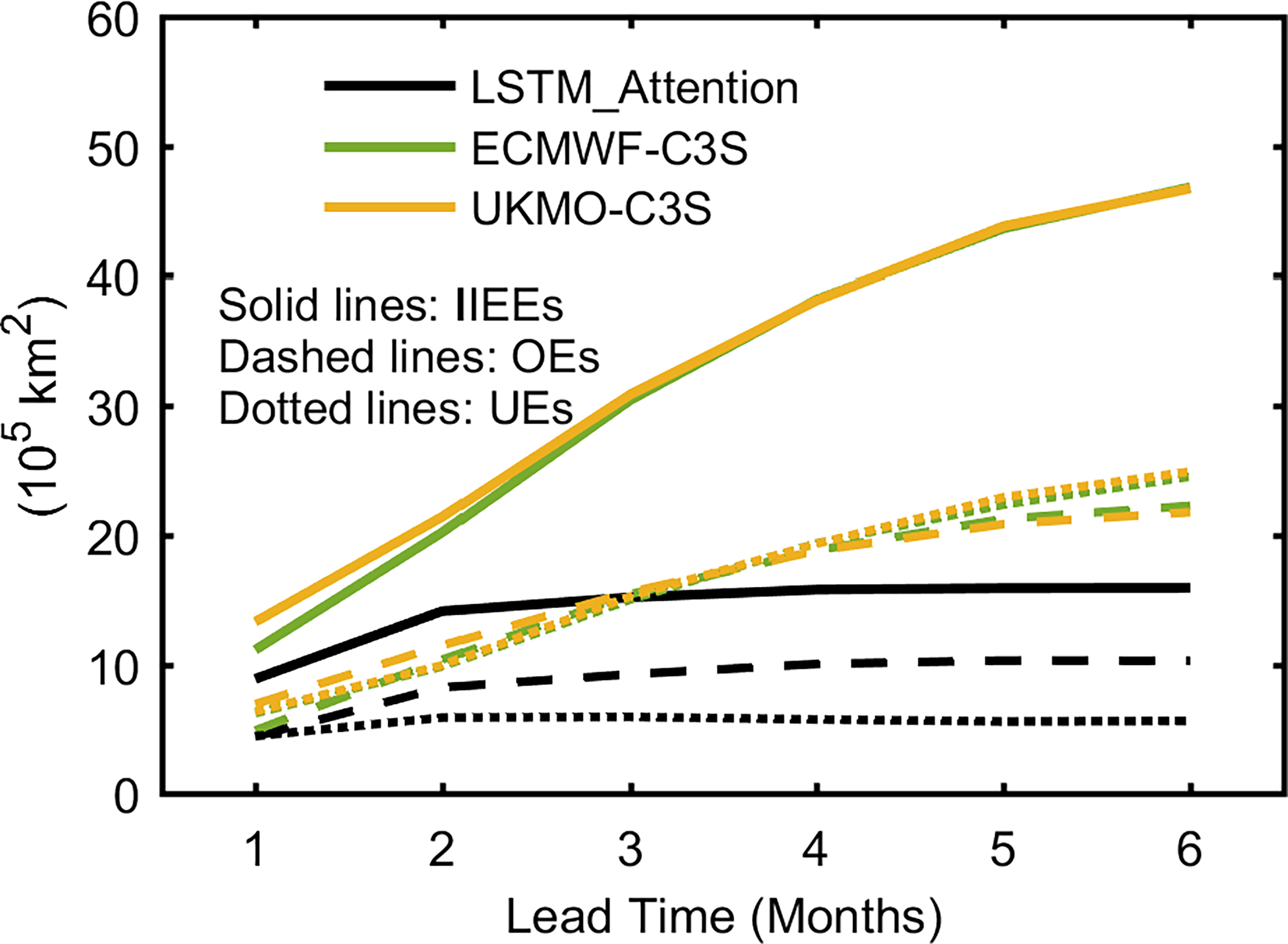 Averaged IIEEs (solid lines), OEs (dashed lines), and UEs (dotted lines) in 2015–2016 of the July–August–September (JAS) sea ice forecasts at lead times of 1 month to 6 months using LSTM_Attention, ECMWF-C3S, and UKMO-C3S.