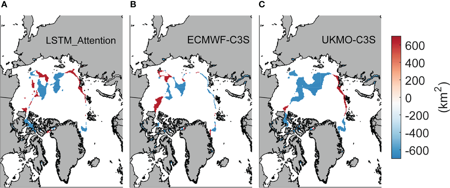 As shown in Figures 7, 8, the attention-based LSTM successfully reproduces the spatial pattern or the regional variation of summer sea ice cover in extreme years that recorded unforeseen SIE minimums. In the first two years, LSTM_Attention outperforms UKMO-C3S and is comparable to ECMWF-C3S in predicting the location of sea ice edge. Yet, in September 2016, the concentration underestimation in central Arctic from LSTM_Attention is obvious and is probably the cause of total SIE underestimation in this September.