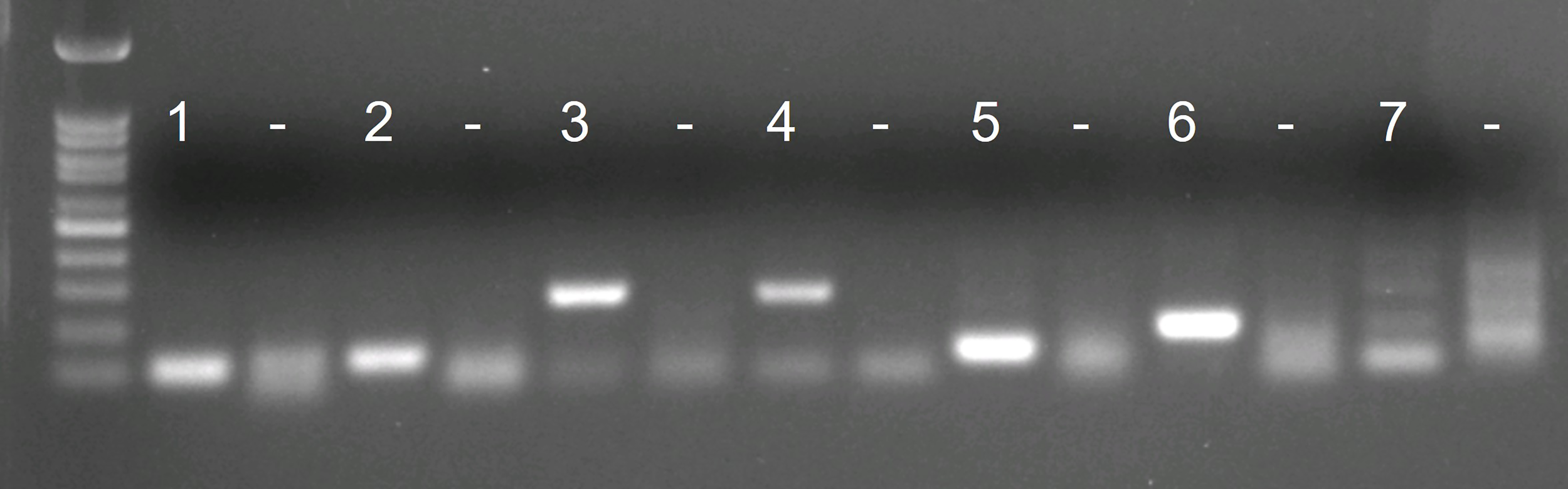 Agarose gel visualizations of the in vitro tests of 7 initial primer combinations. Each primer combination was tested with 2 ng of Sabella spallanzanii DNA and with water as negative control (“–”).