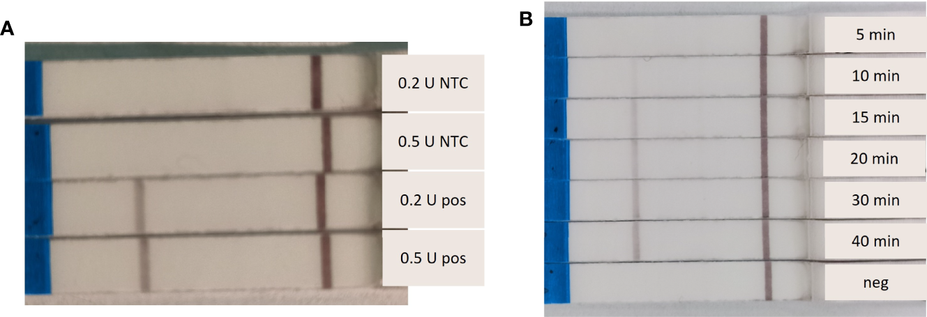 Different Endonuclease IV concentrations and amplification times were tested. The RPA-LF reactions were affected by the concentration of Endonuclease IV. Both tested concentrations (0.2 and 0.5 U) resulted in amplification after 20 minutes at 37°C, however the reaction containing 0.5 U produced a slightly stronger band (Figure 2A). We also observed a clear dependence of the band strength on the incubation time. A band was visible on the flow stick after 10 minutes of amplification time. The band strength increased with increasing amplification time, with maximum band strength after 40 minutes (Figure 2B).