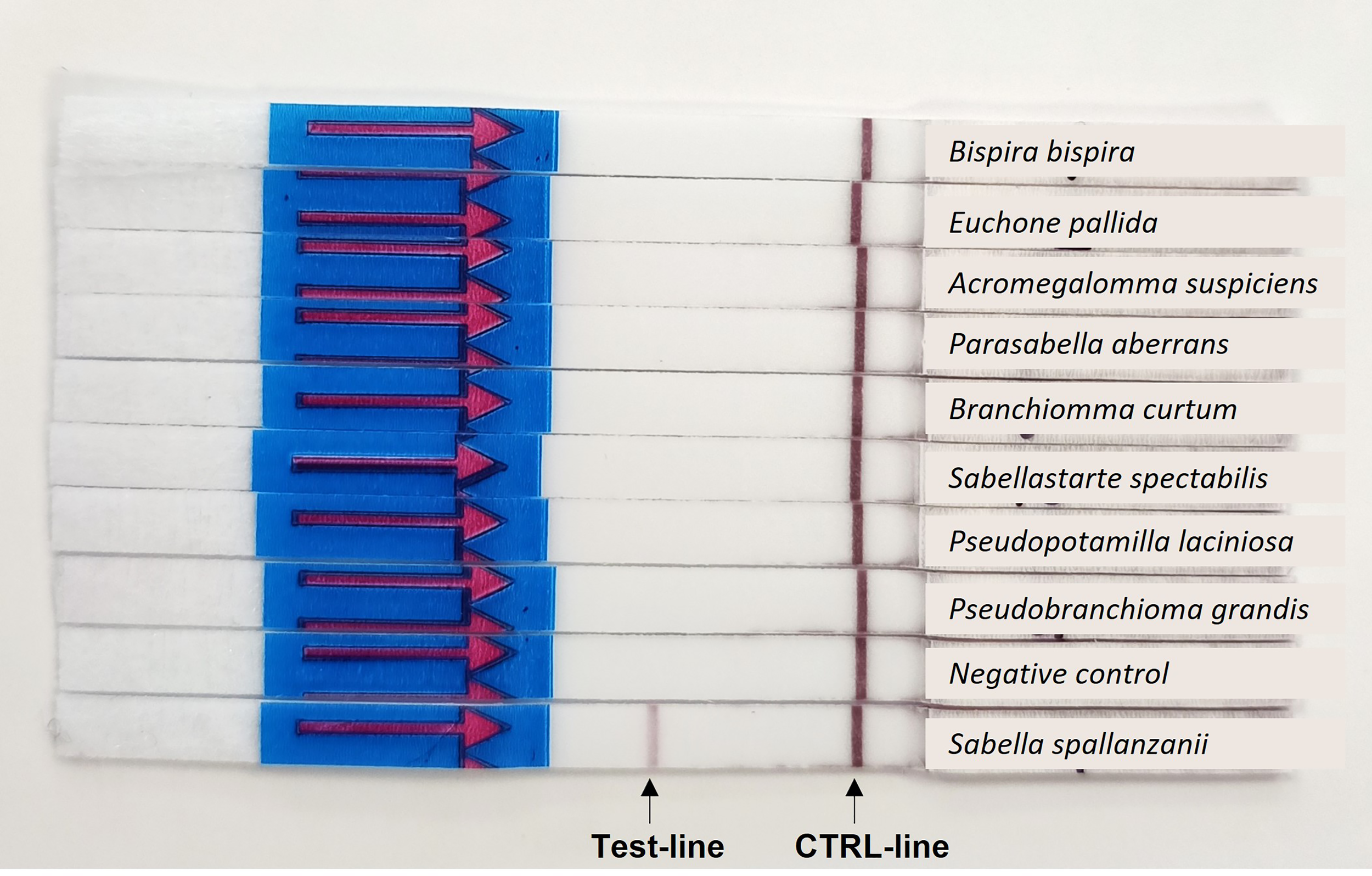 Results of the specificity testing: Positive amplification is indicated by a colored band in the test-line and a colored band in the control (CTRL)-line.