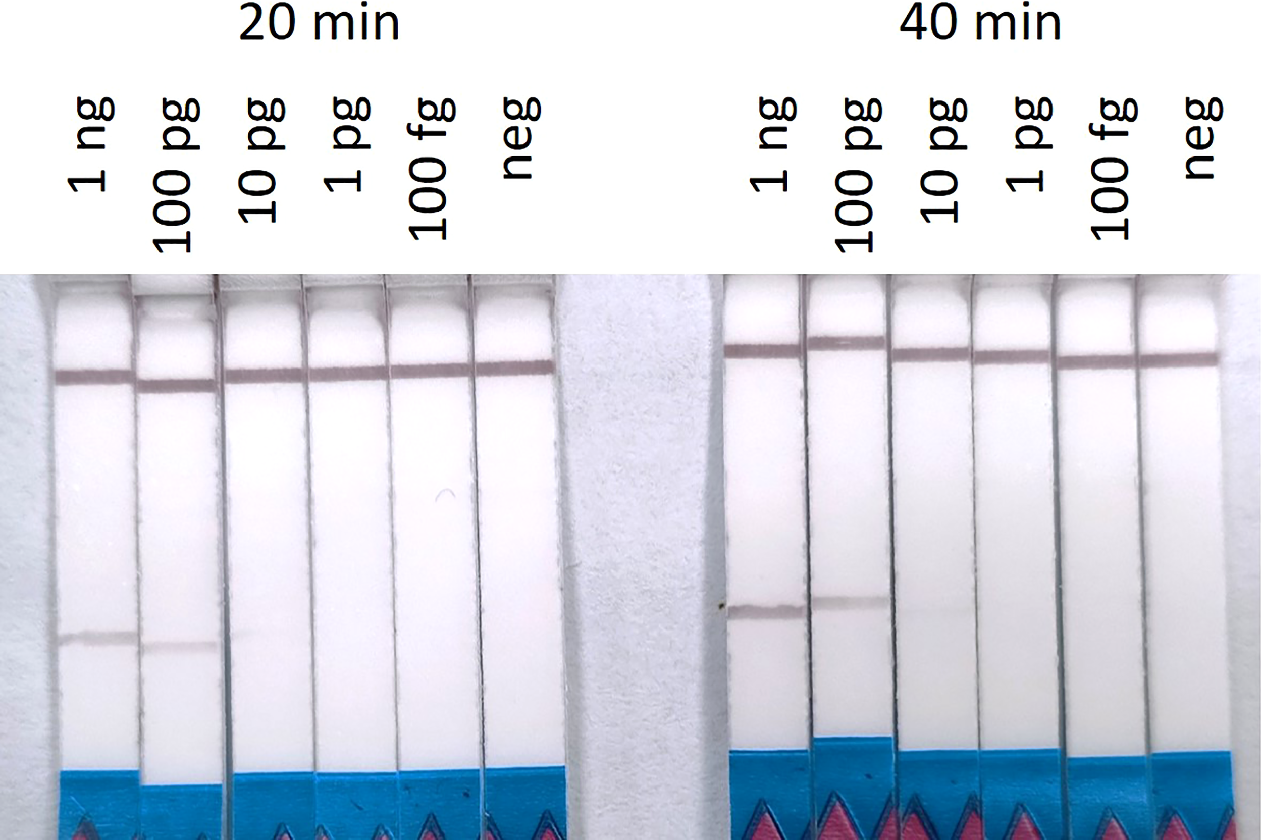 Recombinase Polymorphism Amplification-Lateral Flow (RPA-LF) assay on 10-fold serial dilution of Sabella spallanzanii ranging from 1 ng to 100 fg after 20 min and 40 min of amplification. Positive signals could be seen down to 10 pg of DNA.