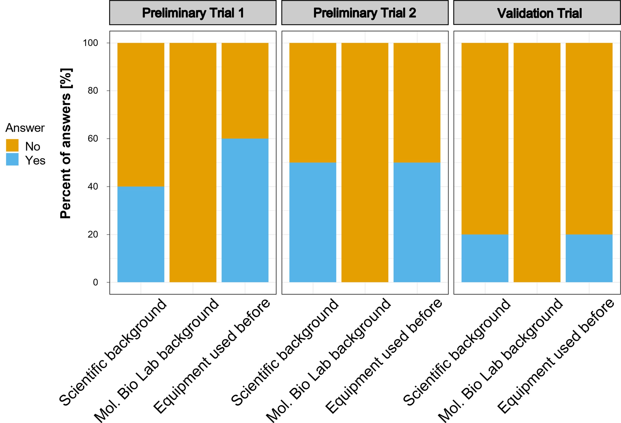 The participants of the preliminary assay trials and the validation trial represented different groups of potential users: biosecurity practitioners, scientists, high-school students, indigenous communities, and public representatives. None of the nine preliminary trial participants had molecular laboratory background. Five participants reported some experience operating a micropipette at least once in the past. Similarly, none of the participants in the validation trial had a background in molecular biology and only 2 out of 10 participants reported having a scientific background and used pipettes before (Figure 6). In the post-experiment surveys of the preliminary trials, participants mainly suggested to include a section about materials and an induction on micropipette usage. The issue regarding micropipette usage was consistent with our observations during the preliminary trials; therefore, we incorporated all observations and feedback from the participants into the final version of the simplified protocol (Supplementary Figure 2) and included a pipetting guide (Supplementary Figure 3) and provided these updated guides to the participants of the validation trial.
