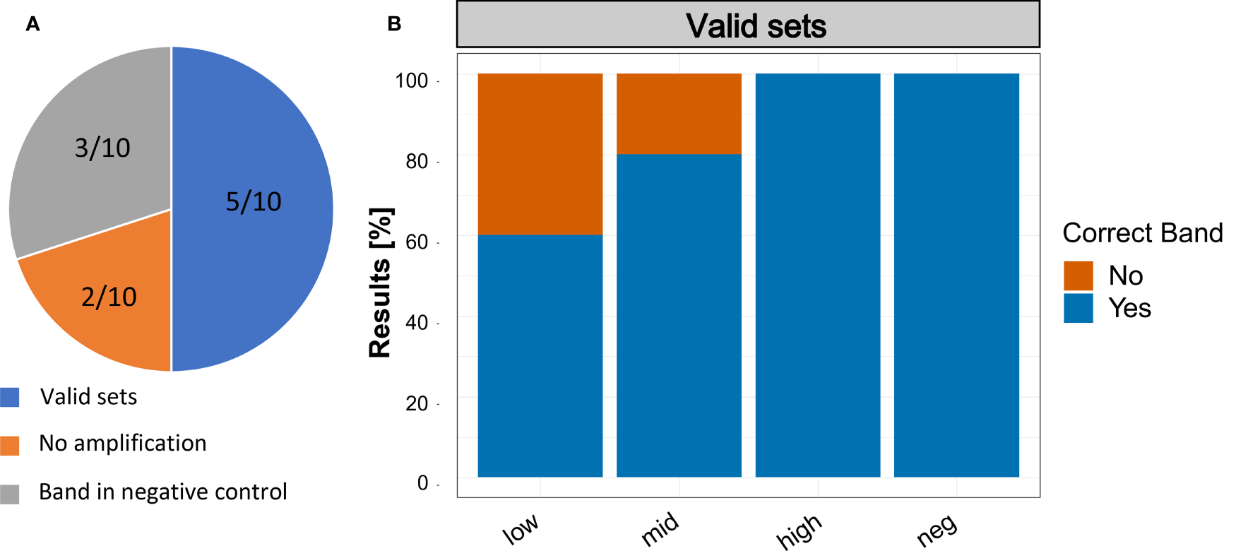 Results of the Recombinase Polymerase Amplification trials with non-scientist users. (A) Summary of the results reported by the participants. Valid sets: Participants that had no band in the negative control and a band in at least one of the three samples with Sabella spallanzanii DNA; No Amplification: Participants that did not report an amplification in any of the samples; Band in negative control: Participants that reported a band in the negative control. (B) Reported results of participants with ‘Valid sets’.