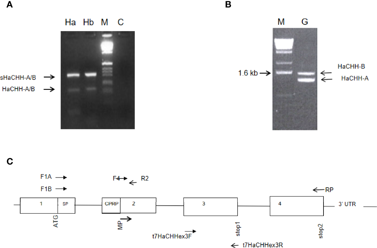 (A) Identification of transcript variants for the HaCHH-A and HaCHH-B genes. Gene-specific forward primers for HaCHH-A (F1A) and HaCHH-B (F1B) were paired with common reverse primer (R2) in the RT-PCR amplification of cDNA from eyestalk (Es). Two major fragments were amplified by each pair of primers. The larger fragment (upper arrow) is the sHaCHH-A or the sHaCHH-B transcript variant; the smaller band (lower arrow) is for transcripts HaCHH-A and HaCHH-B. (B) Gene from eyestalk cDNA of female lobster. Lane Ha: PCR results using primer pair F1A and RP; lane Hb: results for primer F1B/RP; M: DNA size marker; and C: negative, no template control. (B) Genomic PCR detection of multiple HaCHH-A and HaCHH-B genes. The primer pair F4/RP (Figure 2 and Table 1) was used and two distinctive DNA fragments (i.e., 1.4 and 1.6 kb) were amplified. (C) Schematic diagram showing the locations of the primers and the proposed gene structure of the HaCHH genes used in this study.