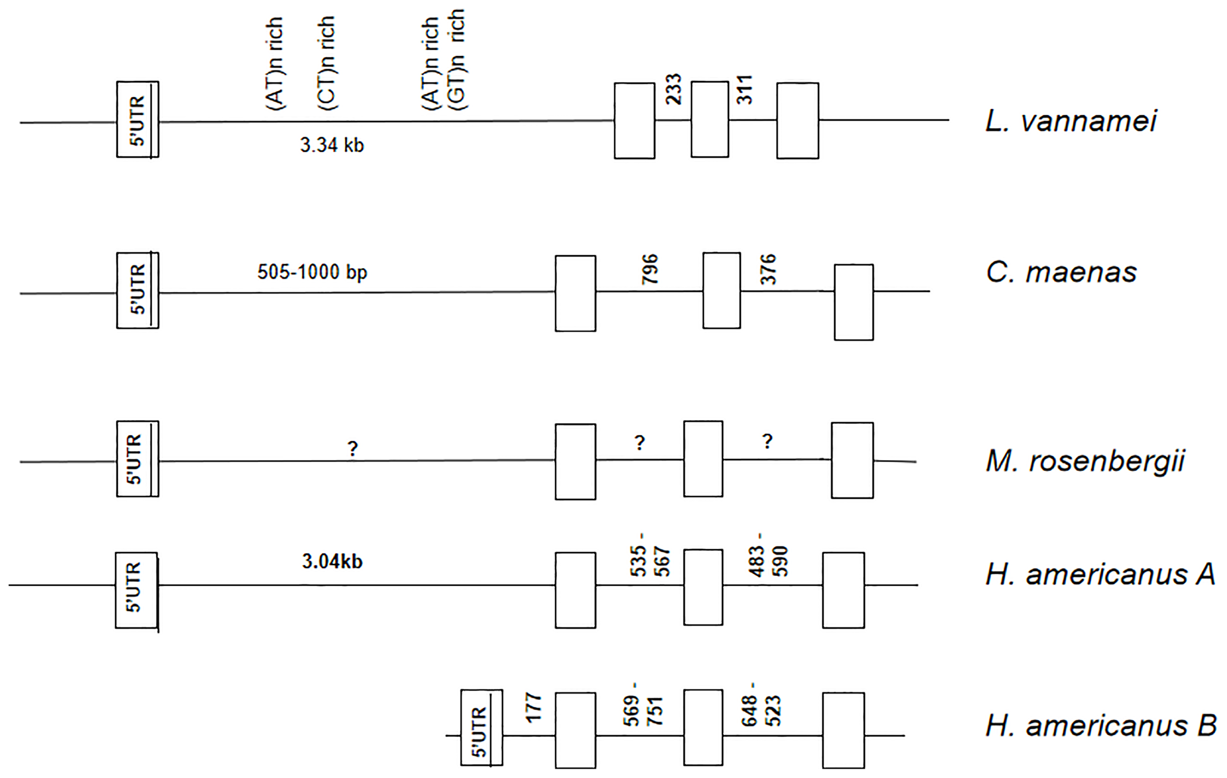 Comparison of the four-exon CHH genes from the lobster Homarus americanus, crab Carcinus maenas, and shrimp Litopenaeus vannamei and Macrobrachium rosenbergii. Exons are indicated by the open boxes and introns are indicated by the horizontal line in between the exons. The first exon consists of the 5′-ÚTR and the ATG start codon. Unknown intron sizes are indicated by an a question mark. Highly repetitive sequence (satellite DNA) clusters were identified in the promoter region of L. vannamei CHH-like gene.