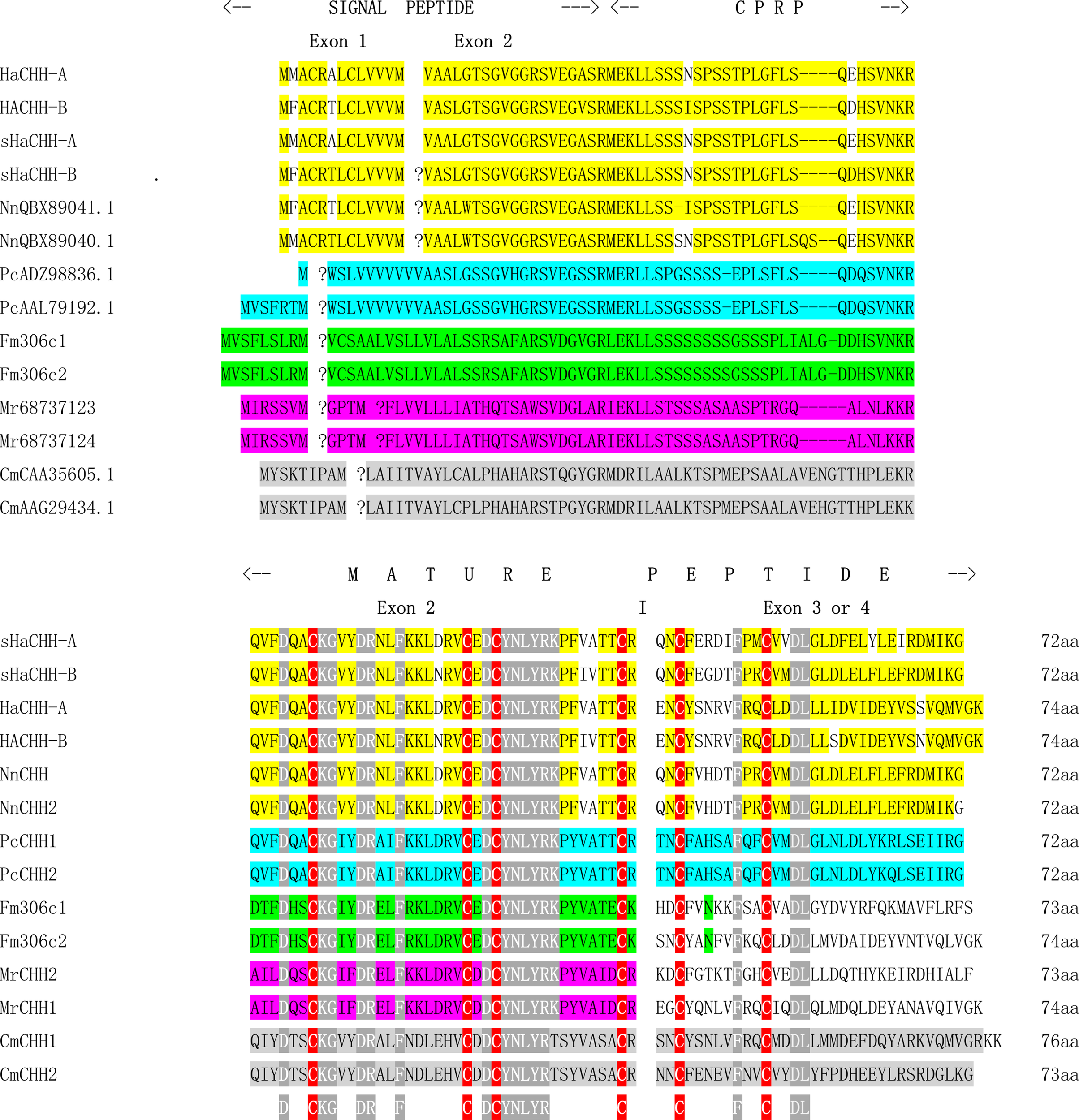 Alignment of the lobster four-exon CHH genes with that of other decapods, including lobster (yellow: HaCHH-A and HaCHH-B; NnCHH-1 and NnCHH-2), crab (gray: CmCHH-1 and CmCHH2), shrimp (green: Fm306-c1 and Fm306-c2) (Shi et al., 2018), freshwater shrimp (pink: MrCHH1 and MrCHH2), and crayfish (blue: PcCHH1, PcCHH2). The same block color indicates the same groups of decapods. Signal peptides and mature peptides are indicated. Gaps are introduced in the boundary of the exons in lobster, shrimp, and crab CHH-like genes. A question mark is inserted in the locations of potential intron insertion sites in the CHH-like genes from other decapods. In addition to the conserved cysteine residues (highlighted in red), several conserved amino acids (highlighted in gray) may be important for motif structure formation of the peptide.