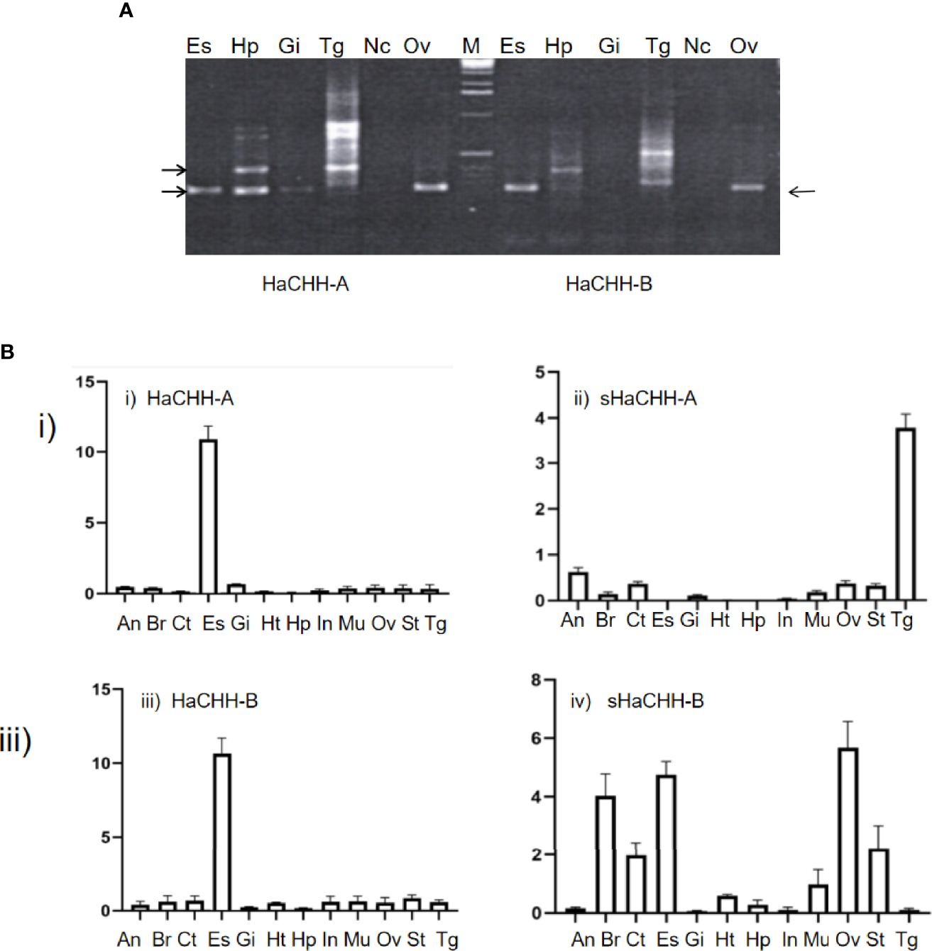 (A) RT-PCR expression study of the HaCHH-A, sHaCHH-A, HaCHH-B, and sHaCHH-B genes in different tissues of the lobster female. The primers F1A and RP were used to amplify HaCHH-A and sHaCHH-A, while primers F1B and RP were used to detect the transcripts of HaCHH-B and sHaCHH-B in the different tissues [eyestalk (Es), hepatopancreas (Hp), gill, (Gi), thoracic ganglion (Tg), nerve cord (Nc), and ovary (Ov)] of lobster during the early reproductive stage (stage I). (A) Representative agarose gels showing the detection of HaCHH-A. HaCHH-B, sHaCHH-A, and sHaCHH-B. The larger (317 bp) fragment is the sHaCHH-A or sHaCHH-B and the smaller (158 bp) fragment is the amplified partial HaCHH-A and HaCHH-B cDNA. (B) qPCR expression study of the i) HaCHH-A, ii) sHaCHH-A, iii) HaCHH-B, and iv) sHaCHH-B genes in different tissues of the female lobster. Primers HaCHH-AF/HaCHH-AR and sHaCHHAF/sHaCHHAR were used to amplify HaCHH-A and sHaCHH-A. Primers HaCHHAF/HaCHHAR and sHaCHH-BF/sHaCHH-BR were used to detect the transcripts of HaCHH-B and sHaCHH-B in the different tissues [abdominal nerve (An), brain (Br), cuticle (Ct), eyestalk (Es), hepatopancreas (Hp), heart (Ht), gill (Gi), intestine (In), muscle (Mu), stomach (St), thoracic ganglion (Tg), nerve cord (Nc), and ovary (Ov)] of lobster during the middle stage of reproduction (II).
