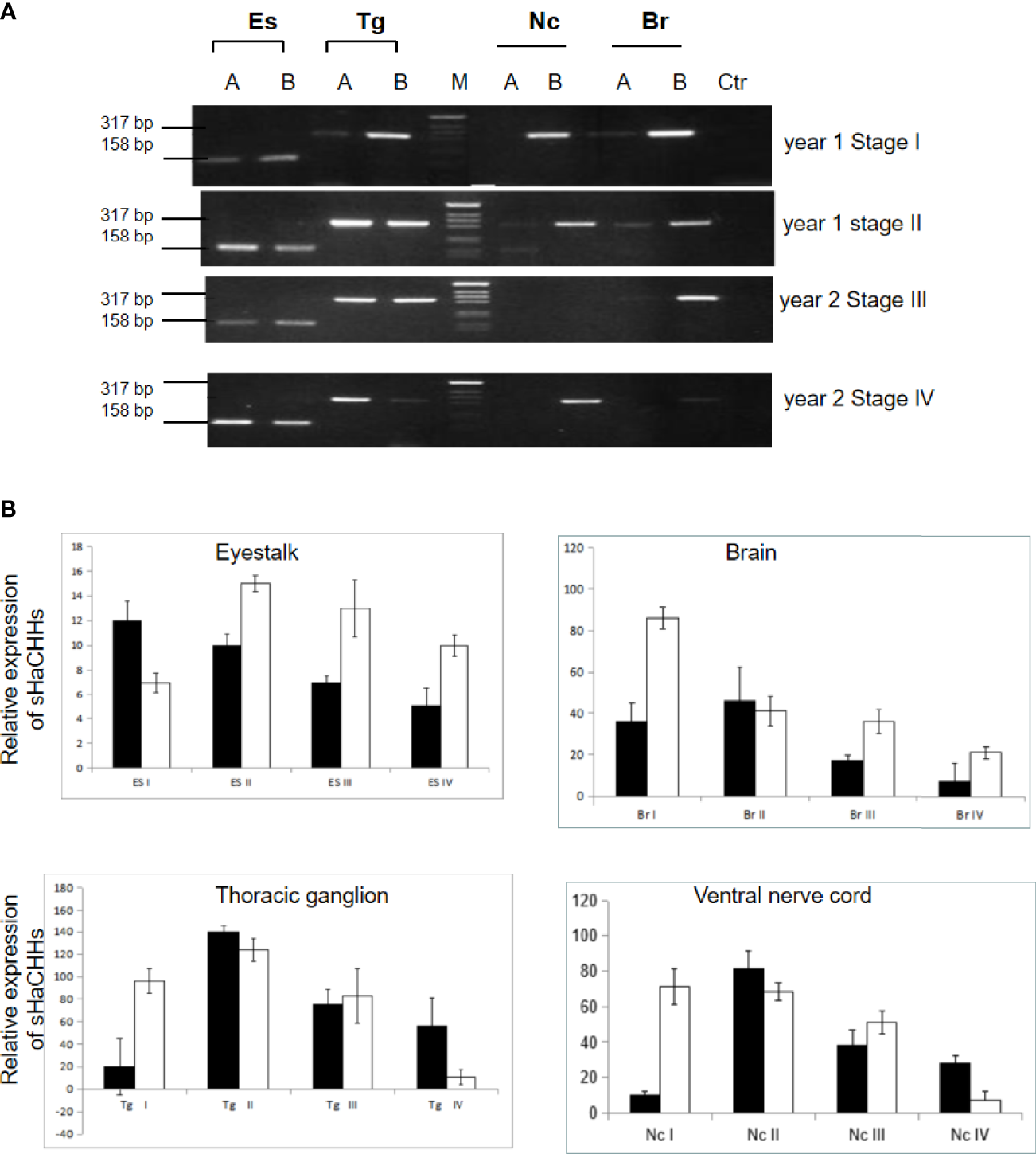 Expression study of sHaCHH-A and sHaCHH-B by Semi-quantitative (A) and (B) qPCR. (A) Agarose gel analysis of the PCR products and detection of the sHaCHH-A, HaCHH-A sHaCHH-B, HaCHH-B. The lanes A used primers for HaCHH-A gene and lane B used primers for HaCHH-B forcDNA from eyestalk (Es), thoracic ganglion (Tg), ventral nerve cord (Nc) and brain (Br).