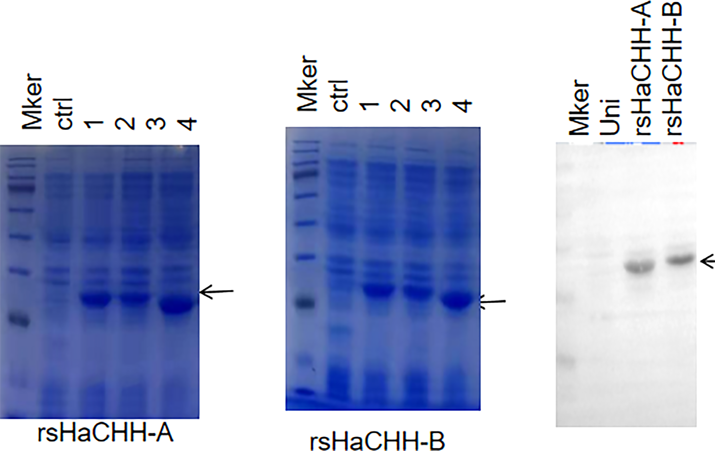 SDS-PAGE (12.5%) analysis of the prokaryotic (Escherichia coli) expression of the recombinant proteins rsHaCHH-A (left) and rsHaCHH-B (middle) after induction by IPTG. Ctrl: uninduced (uni); lanes 1–4: induced and sampled at 2, 4, 6, and 8 h, respectively. Western blot detection of the poly-His-tagged recombinant proteins sHaCHH-A and sHaCHH-B (arrow). Right: The antibody used is the anti-polyhistidine peroxidase conjugate antibody (Sangon Biotech, Shanghai, China).