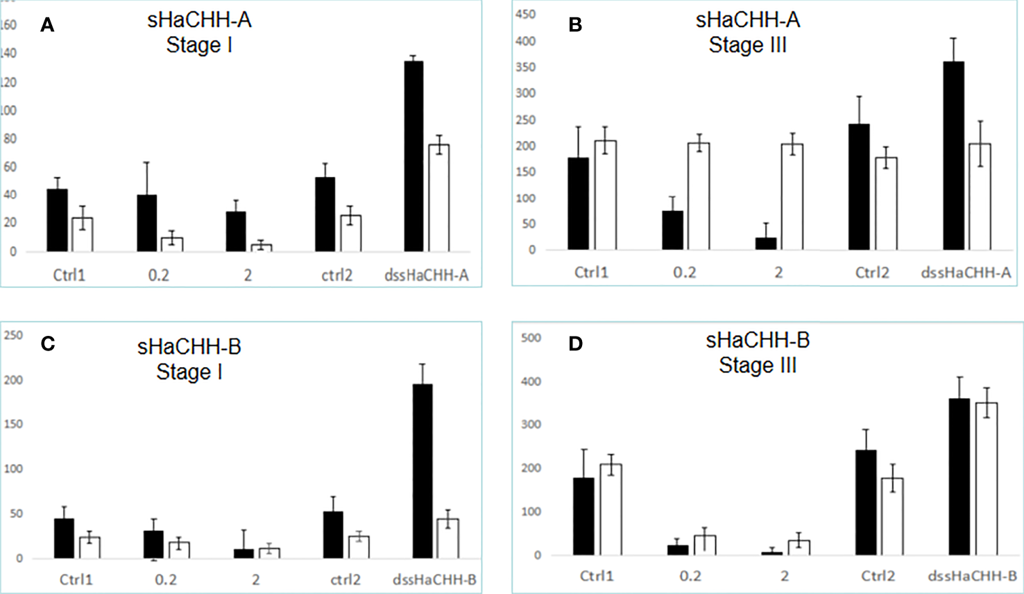 Effect of recombinant proteinand dsRNA for sHaCHH (A, B) and sHaCHH-B (C, D) on HaVg1 gene expression. The Y-axis shows the relative expression level of the HaVg1 gene in the hepatopancreas (black bar) and ovary (open white bar). Triplicate tests (N = 4 samples) were performed for each animal. The lobsters used were in the early stage of vitellogenesis (stage I) and middle–late stage (stage III) of the gonad maturation cycle. Tissue fragments were placed inside the well containing 1.5 ml of the nutrient medium M199 with either the control recombinant protein (0, 0.2, or 2.0 μg/PBS) and ctrl2 dsTFV, 2 μg dssHaCHH-A, or dssHaCHH-B. After incubating for 3 h, the hepatopancreas and ovary fragments were analyzed for the expression of HaVg1. The vitellogenin gene-specific primer was derived from the HaVg1 cDNA, as reported earlier (Tiu et al., 2008). Data are the mean ± SE.