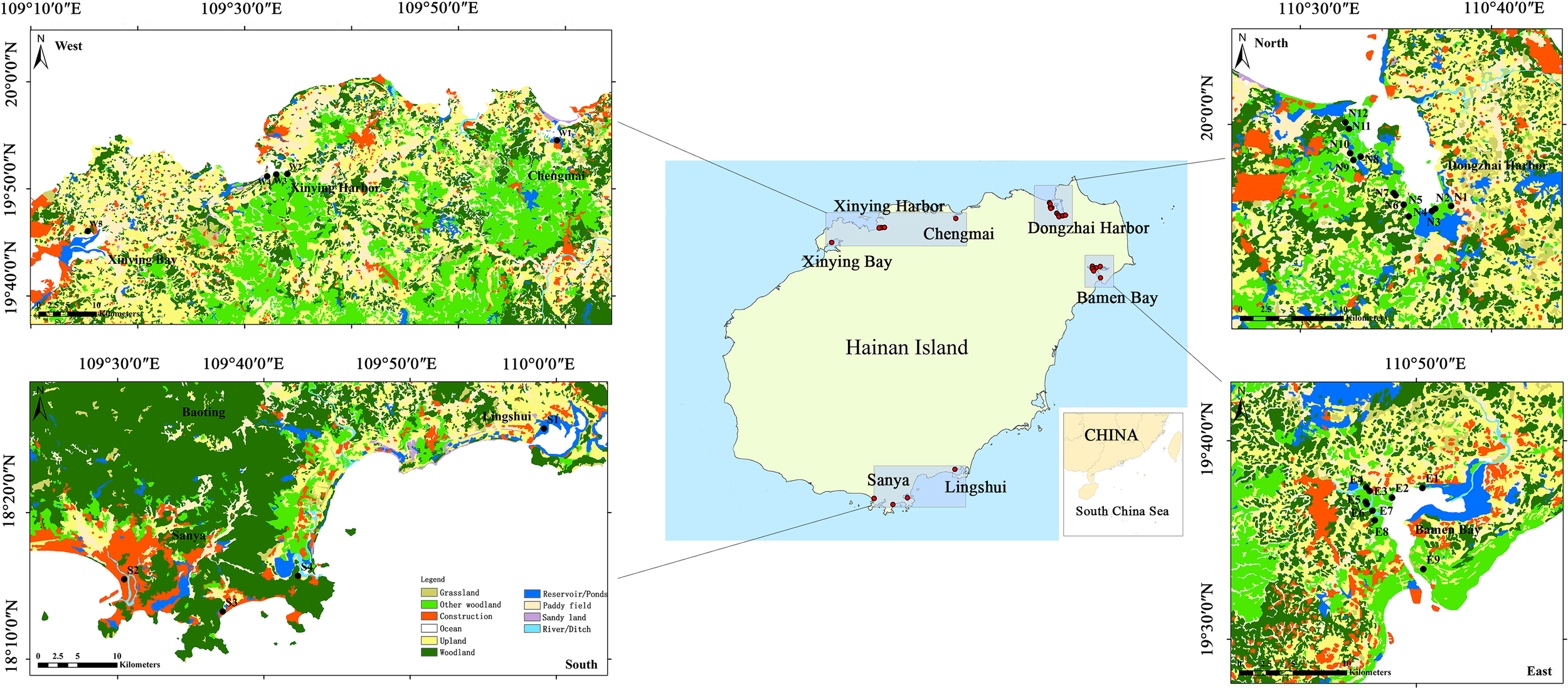 Land use map for mangrove wetlands with the sediment sample locations on Hainan Island in China. Note: mangrove areas are included in the other woodland.