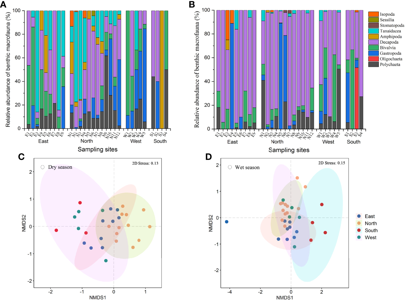 Benthic macrofauna in the mangrove wetlands on Hainan Island in different seasons. Community structure during the (A) dry and (B) wet seasons and non-metric multidimensional scaling (NMDS) maps during the (C) dry and (D) wet seasons.