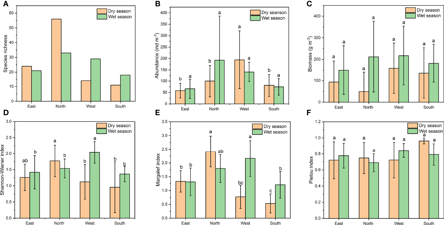 Species richness (A), abundance (B), biomass (C), and diversity indices [(D) Shannon-Wiener index; (E) Margalef index; (F) Pielou index] for the mangrove benthic macrofaunal communities on Hainan Island in different seasons.