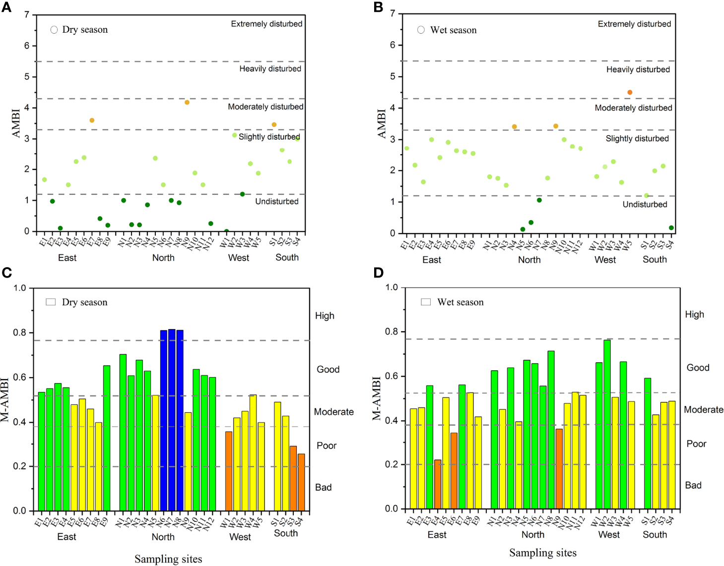 Habitat ecological quality of the mangrove wetlands on Hainan Island based on AZTI’s Marine Biotic Index (AMBI) during the (A) dry and (B) wet seasons and the multivariate AMBI in the (C) dry and (D) wet seasons.