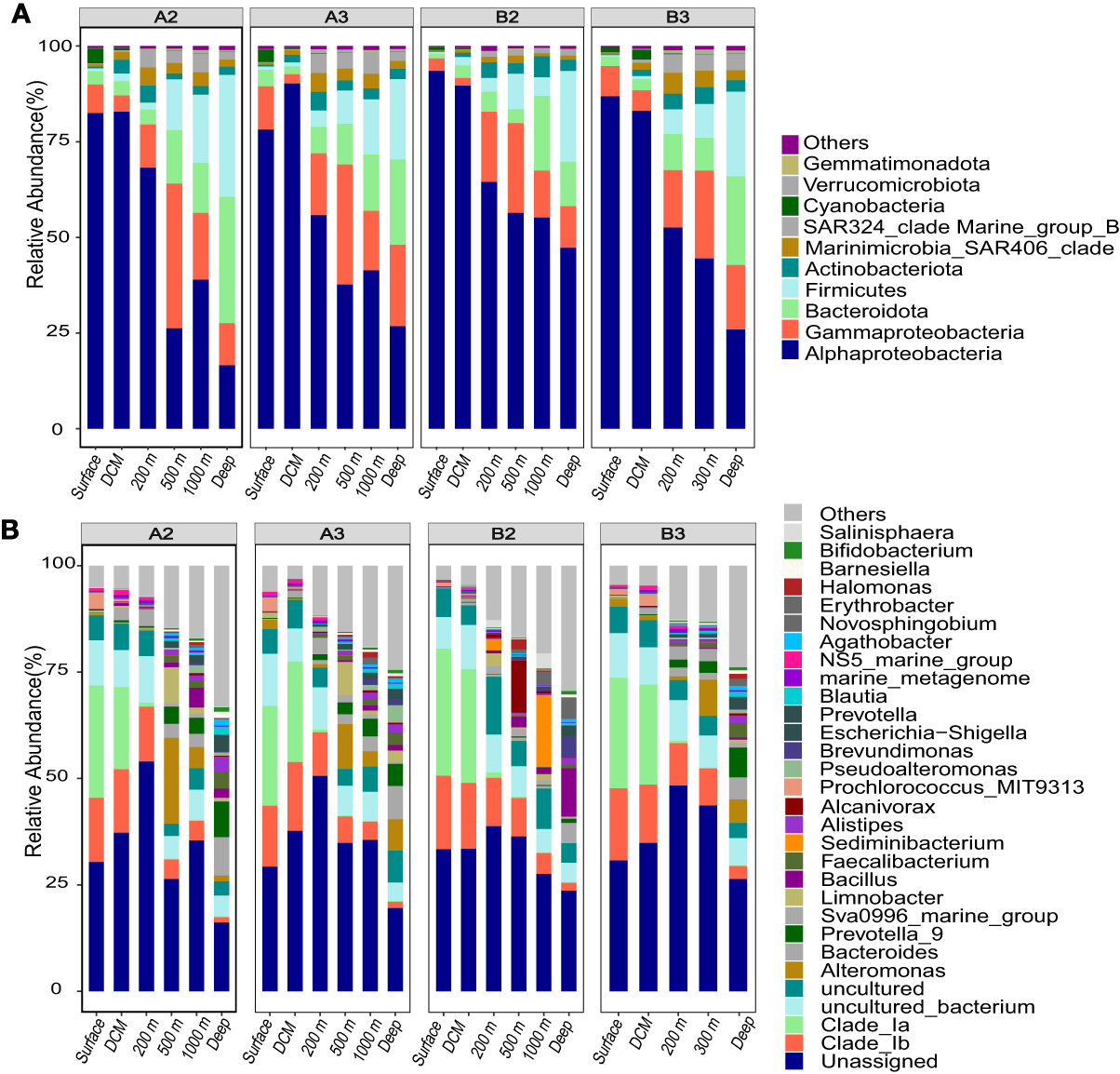 The composition of bacterioplankton communities in four stations along the M5 seamount. (A) phylum level (Proteobacteria at class level); (B) genus level.