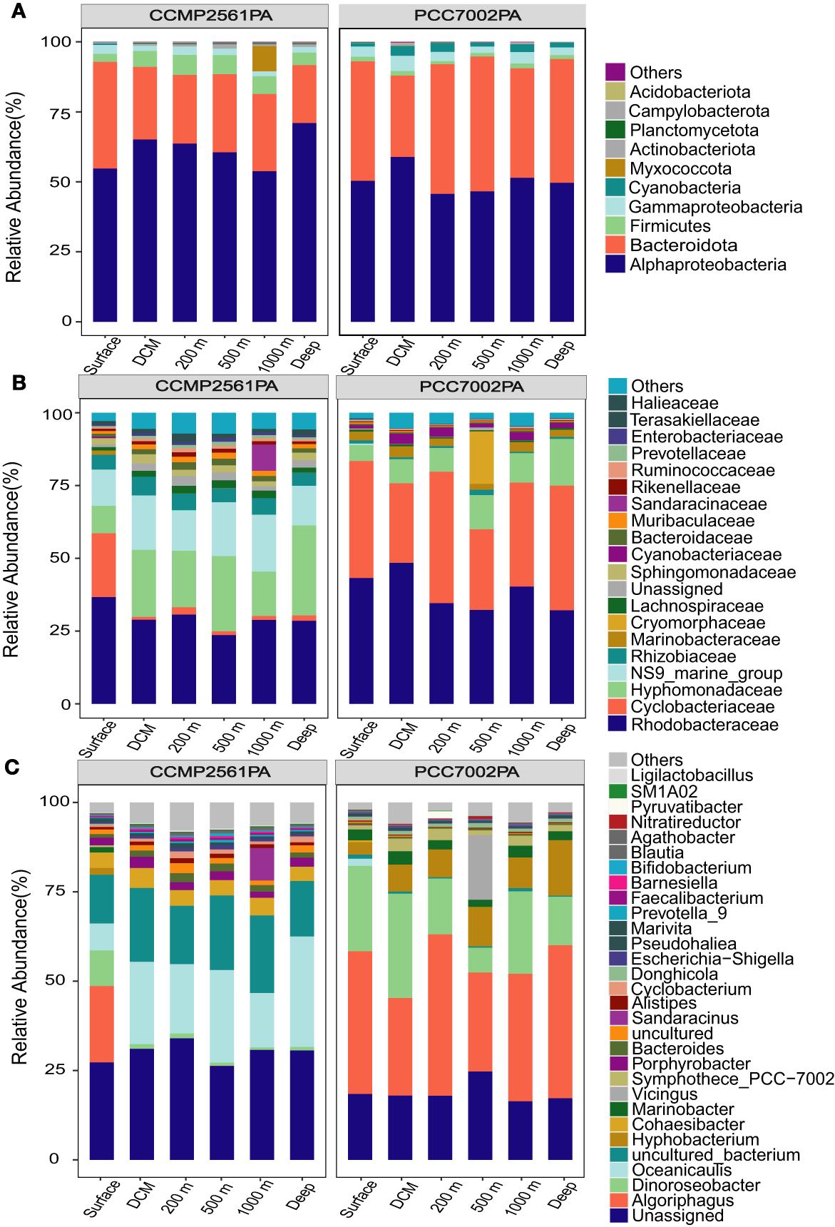 The structure of bacterial communities in different water layers after co-cultivation with Synechococcus sp. PCC7002 and Phaeodactylum tricornutum CCMP2561, respectively, at the phylum (A), family (B), and genus (C) level.