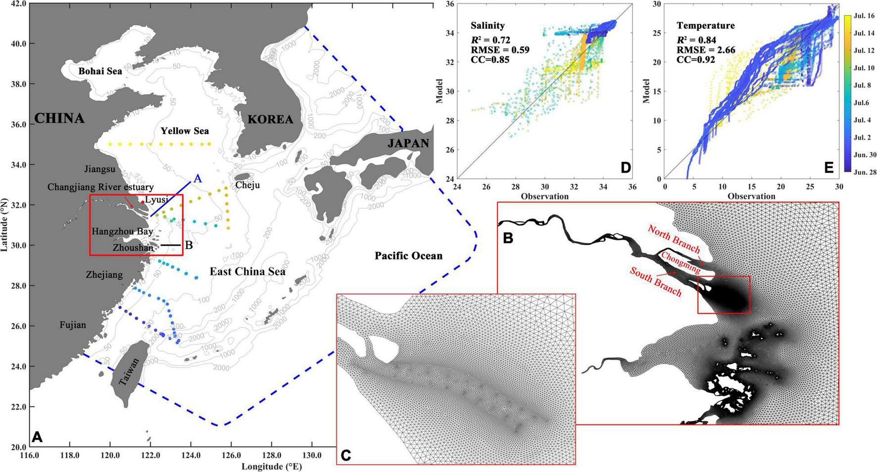 Figure 1. (A) The model coverage with the observation stations during the first cruise from June 28 to July 16, 2006, two cross-sections A/B in blue/black solid lines, and zoom-in mesh-grids in (B) the Changjiang River estuary [red box in panel (A)] and (C) the Deep Navigation Channel [red box in panel (B)]. The comparison between the observed and modeled (D) salinity and (E) temperature during the first cruise. Color in panels (A,D,E) indicate the date of measurements.