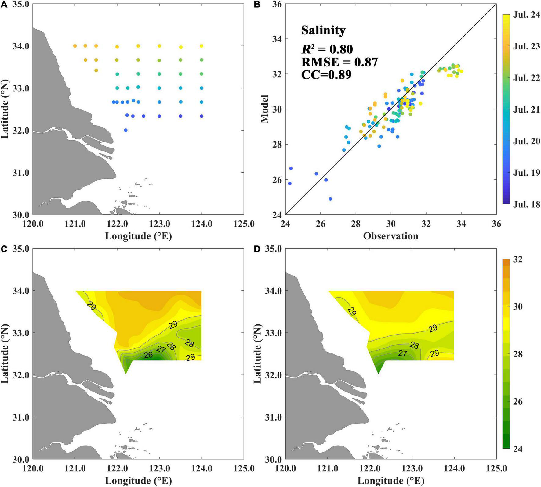 Figure 2. (A) Distribution of the observation stations and (B) the comparison between the (C) observed and (D) modeled salinity during the second cruise from July 18 to 24, 2006. Color in panels (A,B) indicate the date of measurement.