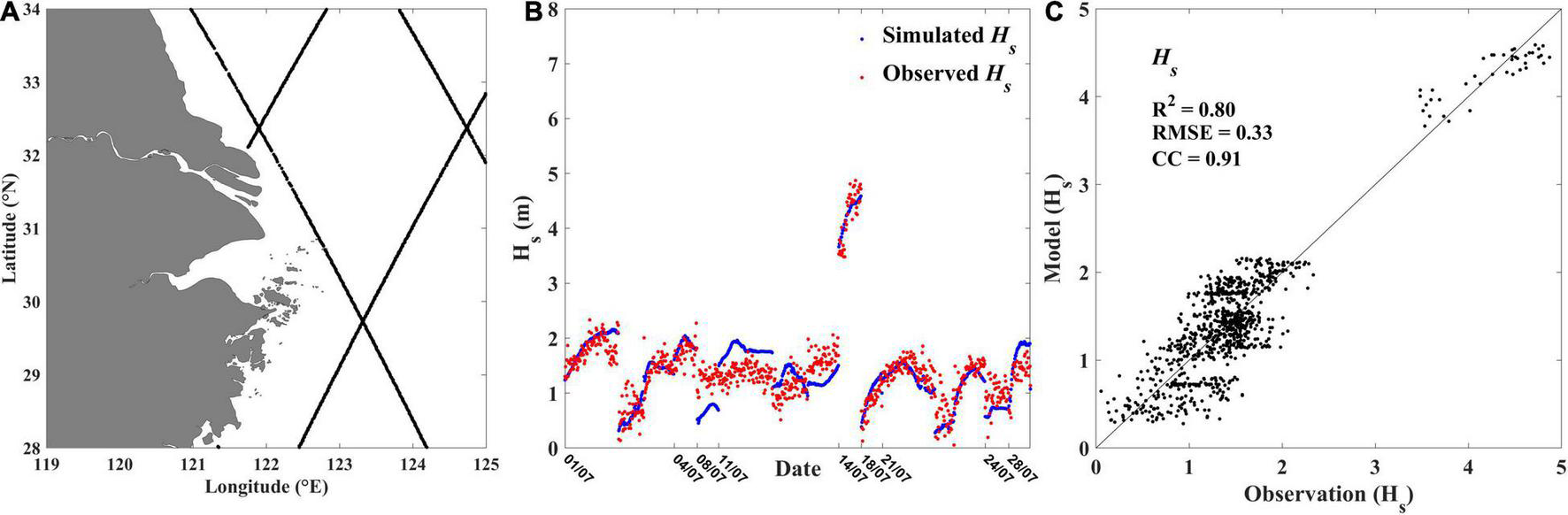 Figure 4. (A) The distribution of observation points along the satellite orbit over the East China Sea during July 2006. (B,C) The comparison between the observed and simulated significant wave height (Hs).