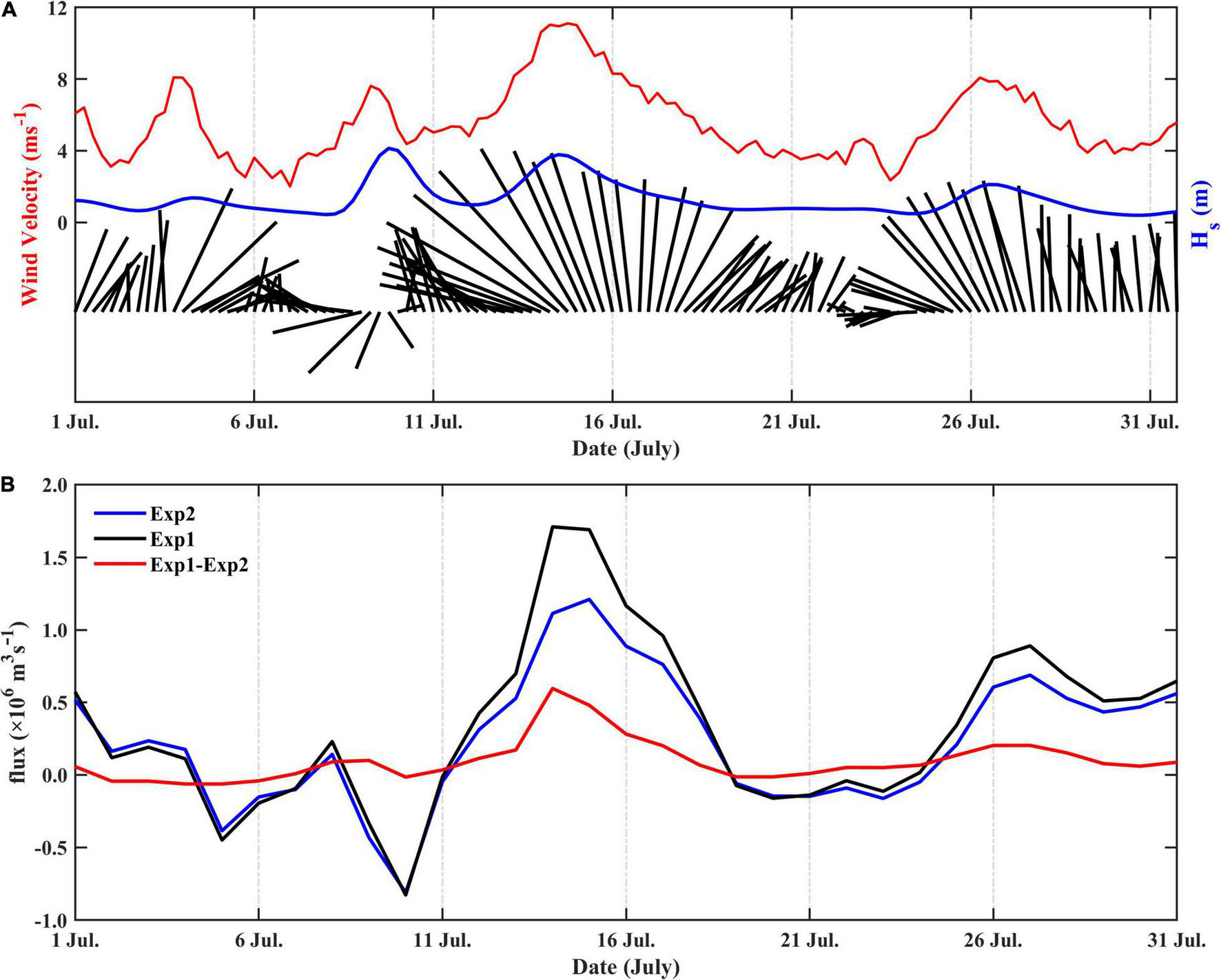 Figure 5. (A) The wind vector (black), magnitude (red), and simulated significant wave height (blue) in the Changjiang River estuary (spatially-averaged within the range of Figure 4A) during July 2006. (B) The daily-averaged current flux across the cross-section B (30°N, 122.5∼123.5°E) during July 2006. Positive indicates northward flux.